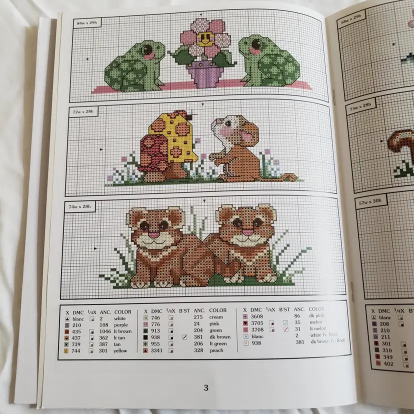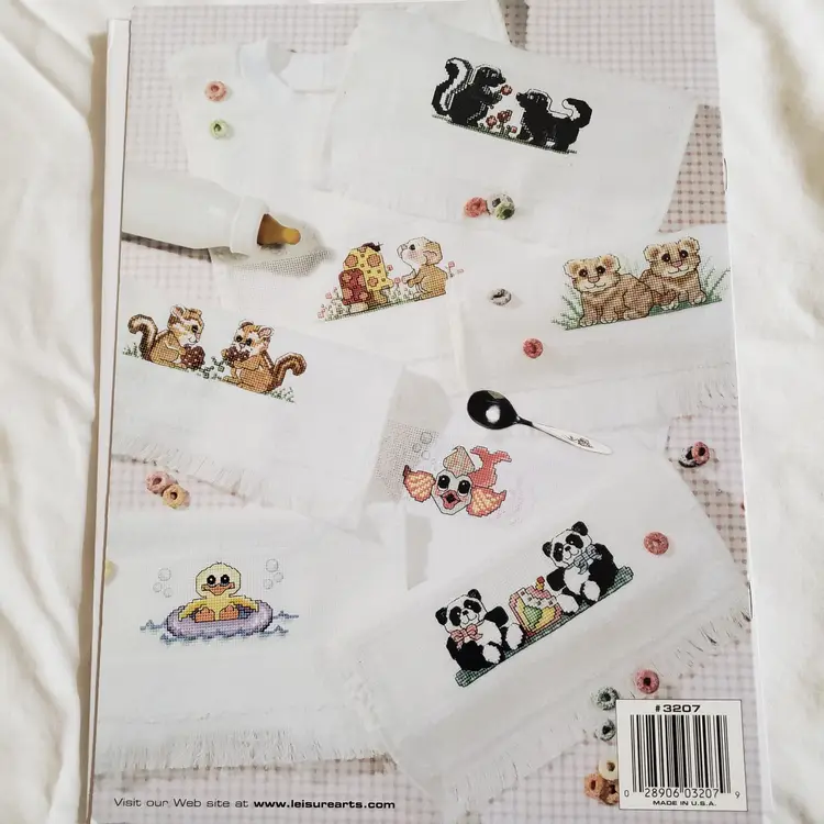 Used leaflet contains 12 designs to cross-stitch on baby bibs. Designs are by Terrie Lee Steinmeyer 2000 for Leisure Arts. Leaflet is in good used condition.