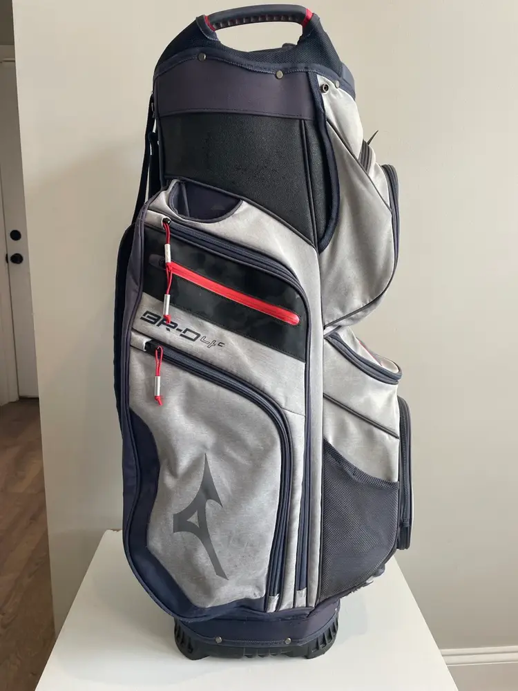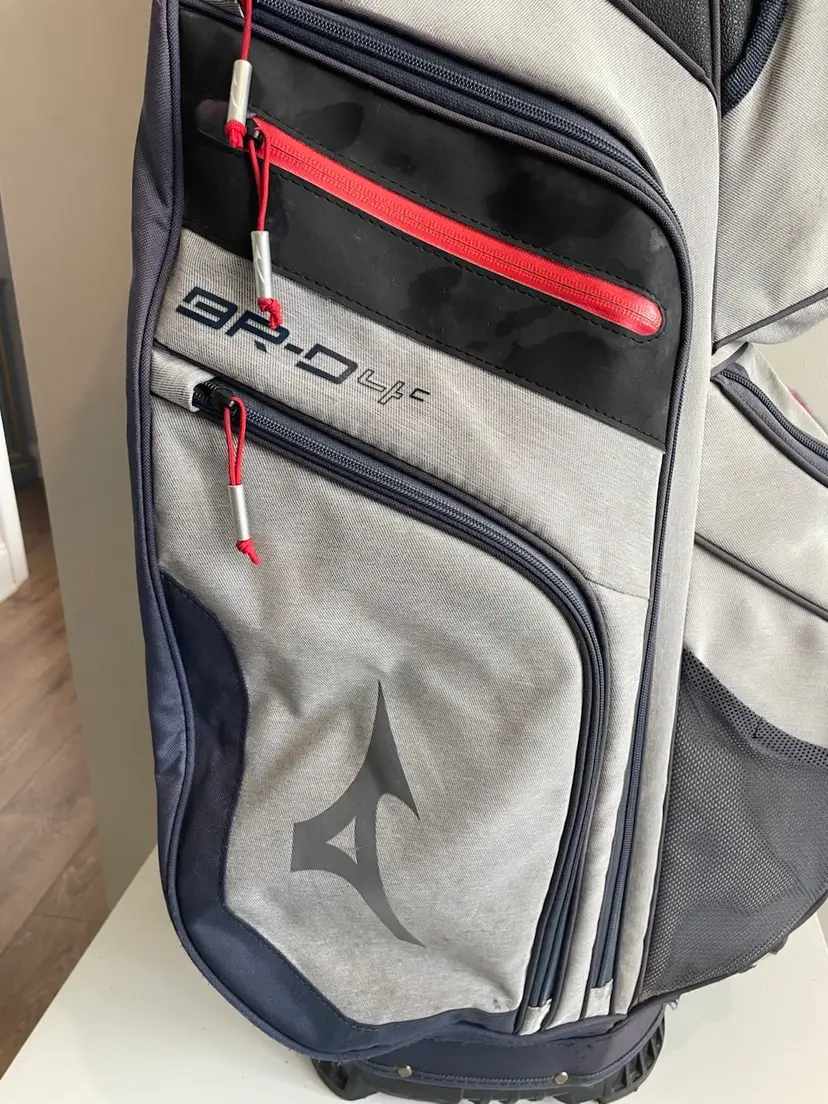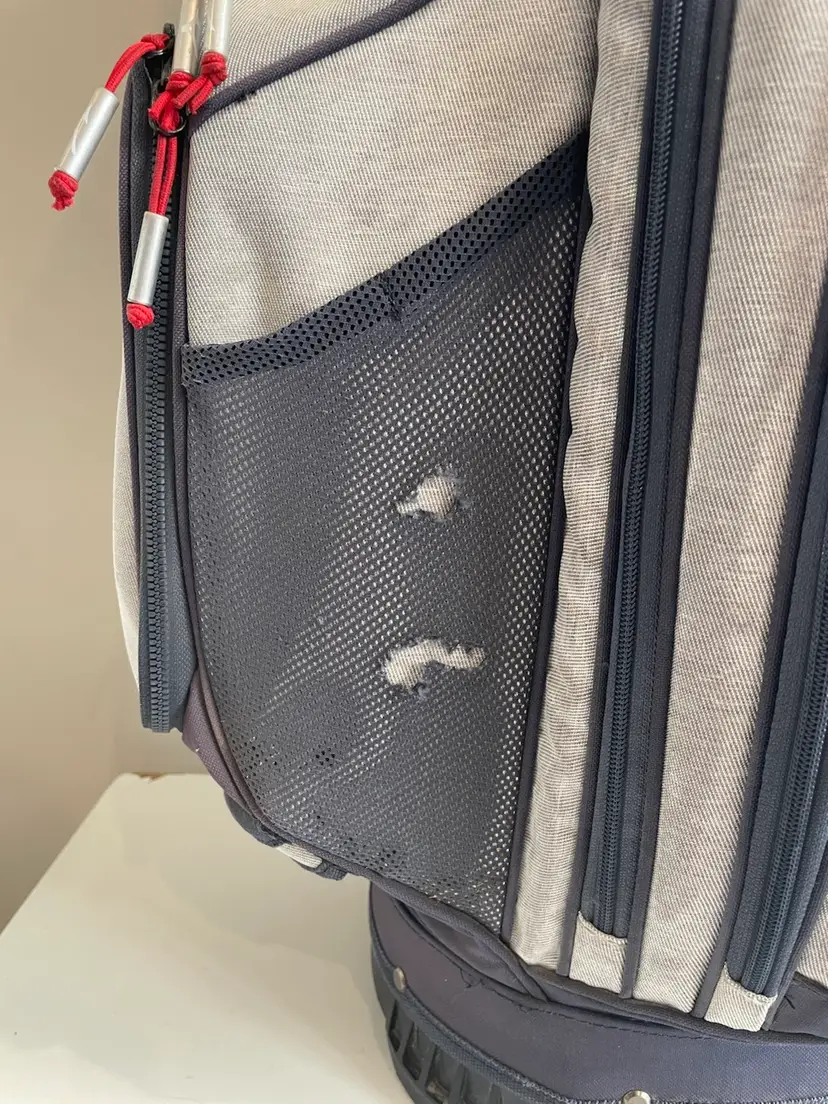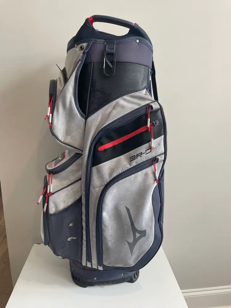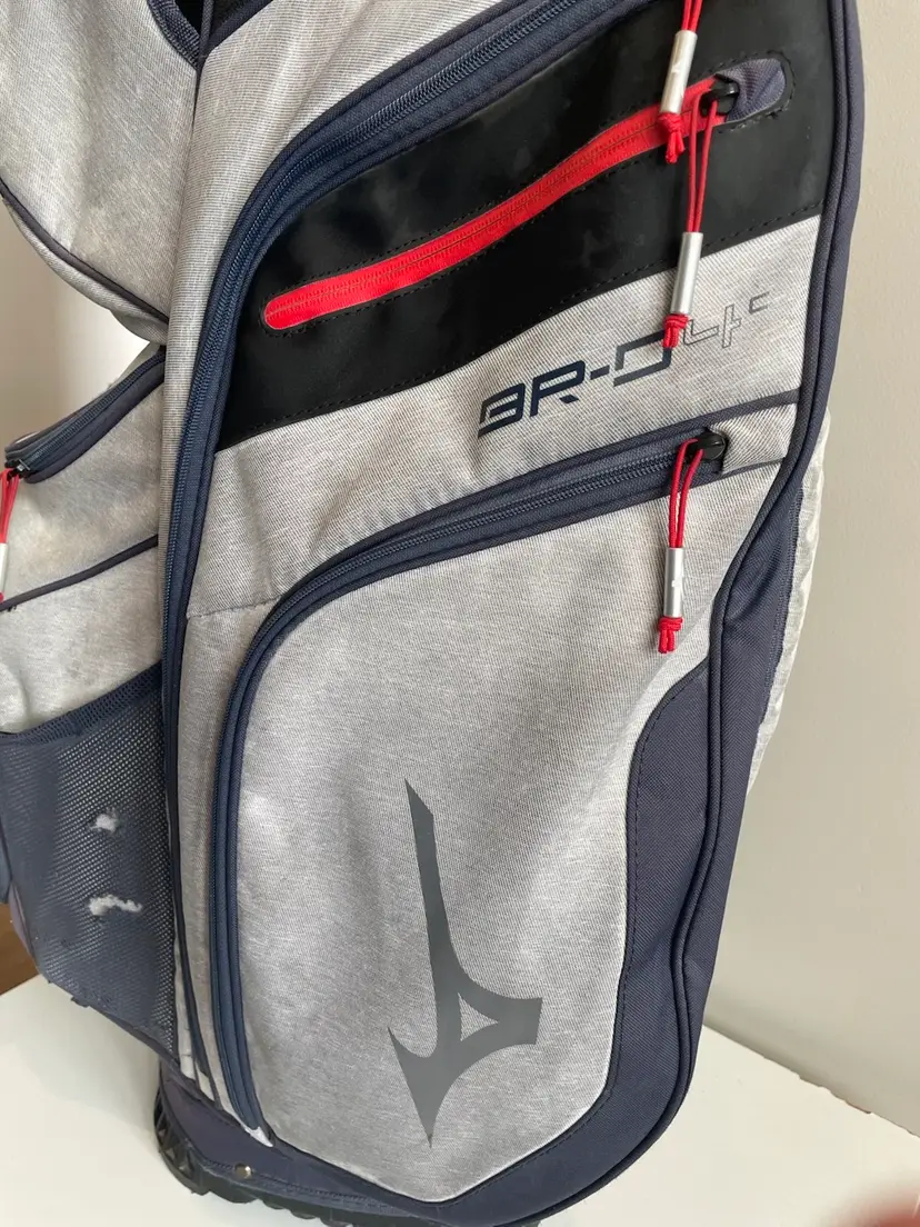 Used golf bag in good condition. Rain cover included. Small signs of fading from normal use. All zippers work. Small tear in bottom of bag. (not visible unless you turn bag over)