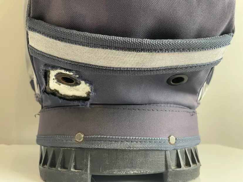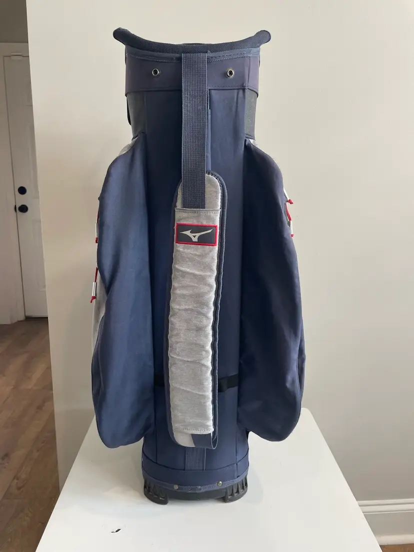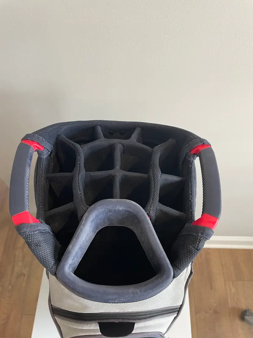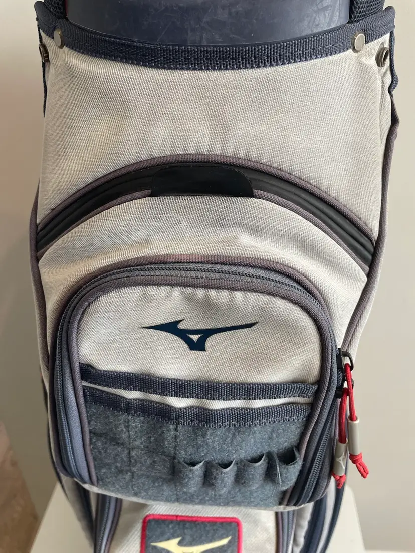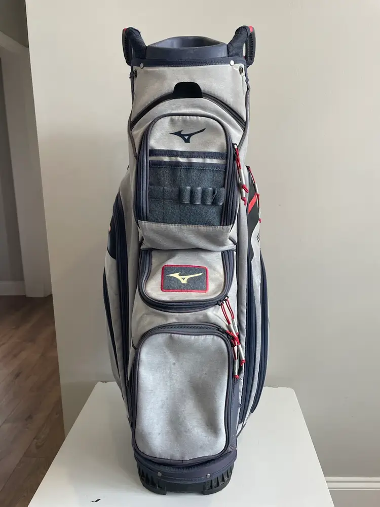 Used golf bag in good condition. Rain cover included. Small signs of fading from normal use. All zippers work. Small tear in bottom of bag. (not visible unless you turn bag over)