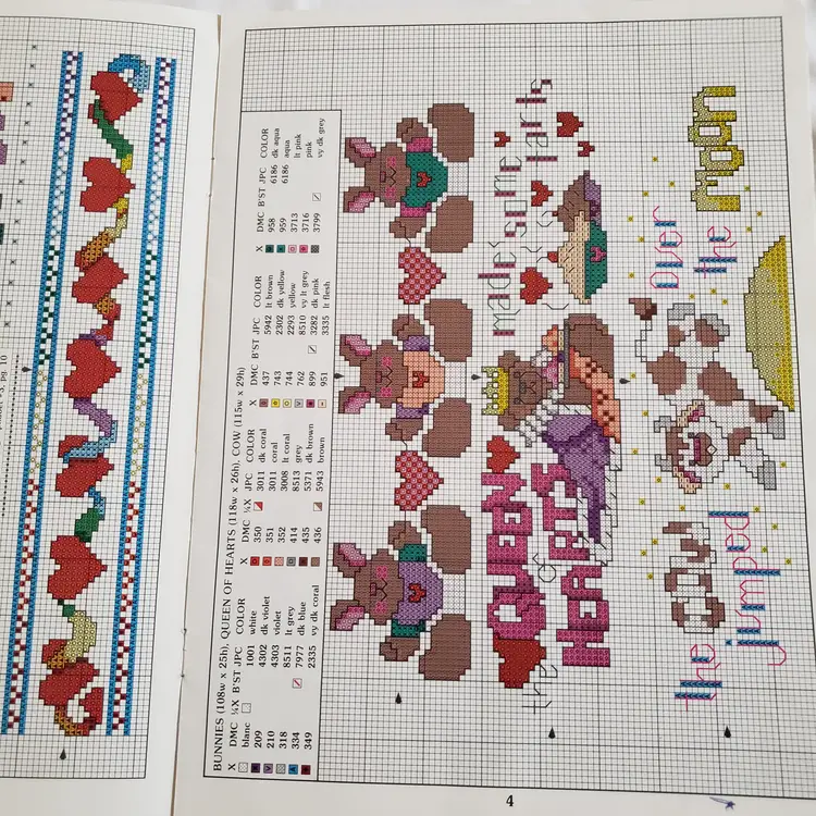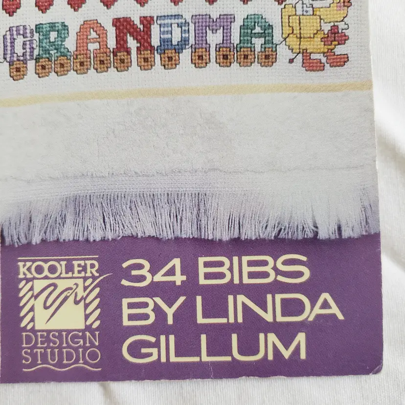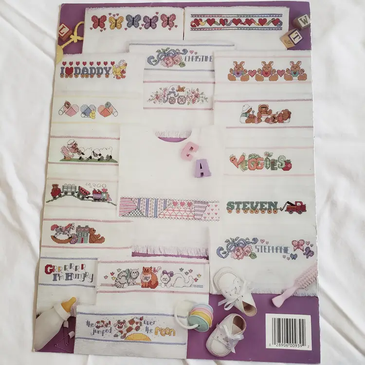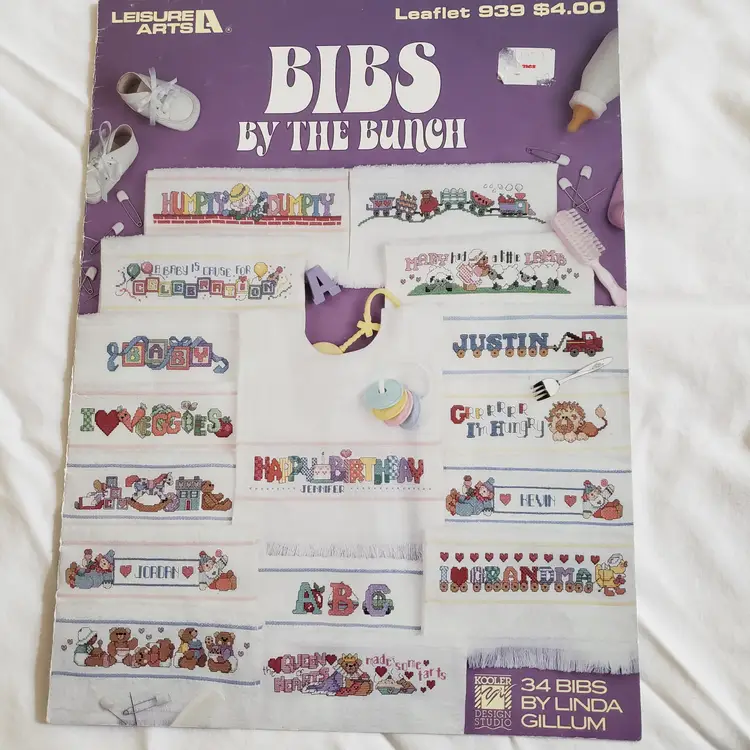 Leaflet contains 34 cross-stitch patterns to stitch on baby bibs. Leaflet is used and has some wear on edge of book cover (see picture) and is ten pages long.