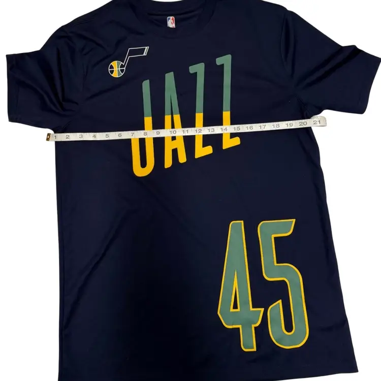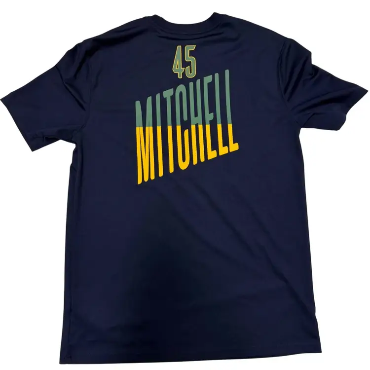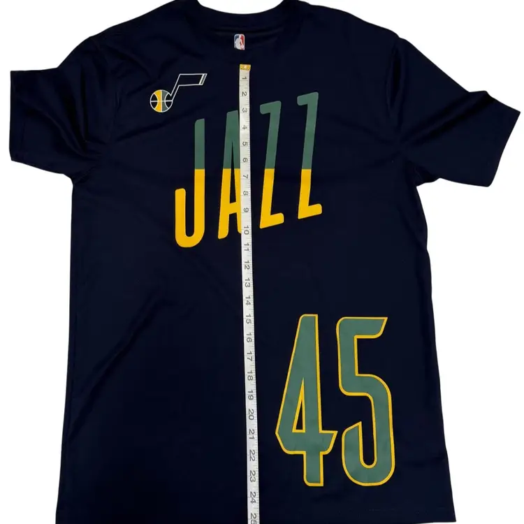 The Utah Jazz NBA Donovan Mitchell #45 Navy Blue Jersey Quick Dry T-Shirt by NBA is an officially licensed shirt featuring the Utah Jazz player's name and number. Made of quick-dry material, this navy blue shirt is perfect for basketball fans looking to show their support for the team during the regular season. With a unisex adult size M, it is a versatile and stylish addition to any fan's wardrobe.