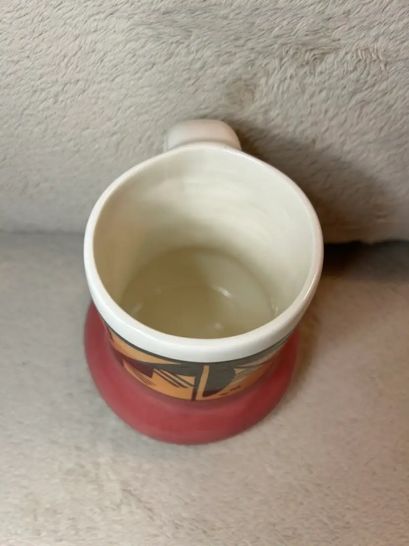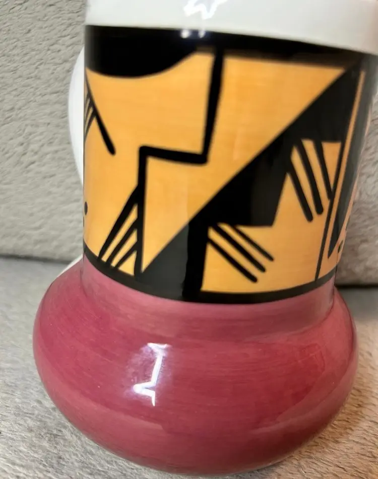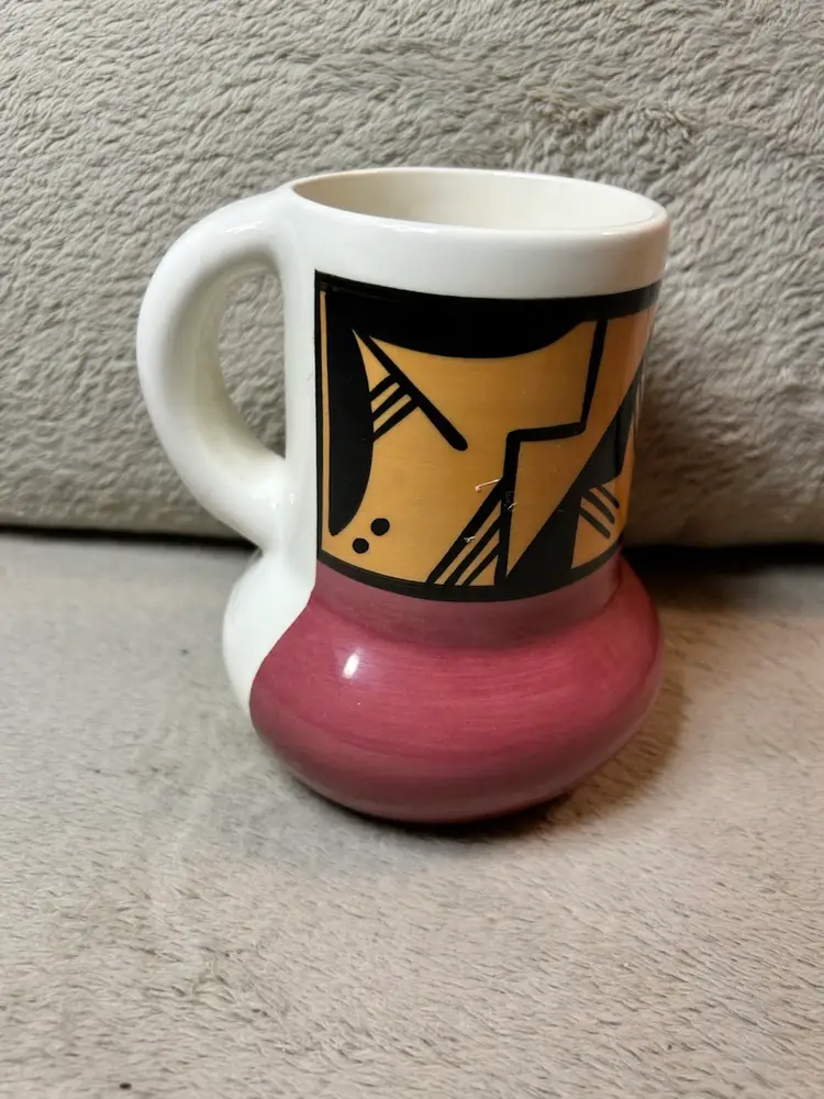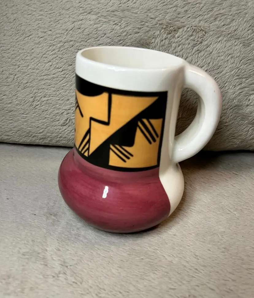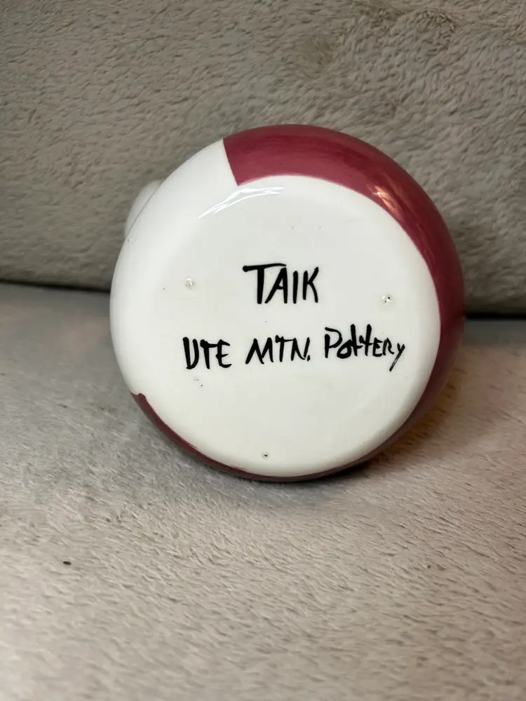 This is a handmade pottery mug created by an artist from the Ute Mountain Tribe.