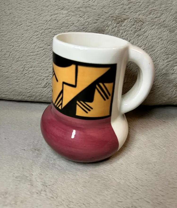 The mug is a stoneware coffee cup featuring a unique design inspired by Native American culture.