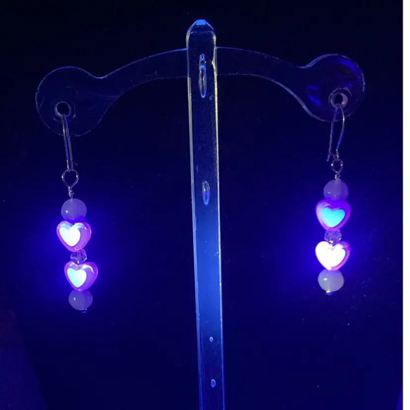 UV Reactive Heart 1 3/4” Drop Earrings! Silver Tone Fish Hooks. Made By Me! NEW to District? Enter code Michel42 into your wallet prior to your first purchase and save $5 off of $10 or more! Happy Hunting! Thank you for checking out my items! I do combine shipping and refund for any overages!