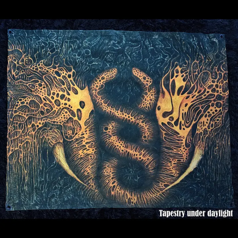 Transform your space with this striking tapestry of my dark surreal oil paintings.