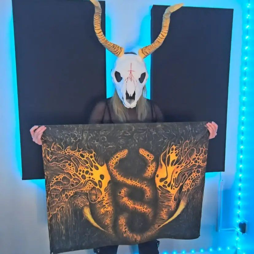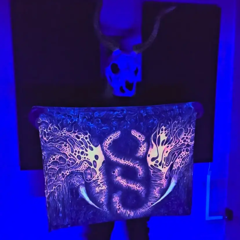 Made from high-quality lycra fabric, the tapestry features a soft matte finish with a slight stretch, ensuring durability and wrinkle-free look. Printed with UV-reactive inks, the artwork glows under black light, revealing hidden details and giving the piece a mesmerizing, trippy 3D effect that comes alive in the dark.