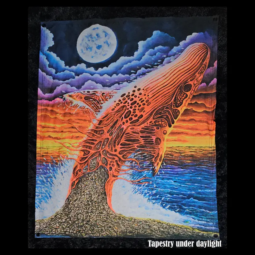 Made from high-quality lycra fabric, the tapestry features a soft matte finish with a slight stretch, ensuring durability and wrinkle-free look. Printed with UV-reactive inks, the artwork glows under black light, revealing hidden details and giving the piece a mesmerizing, trippy 3D effect that comes alive in the dark.
