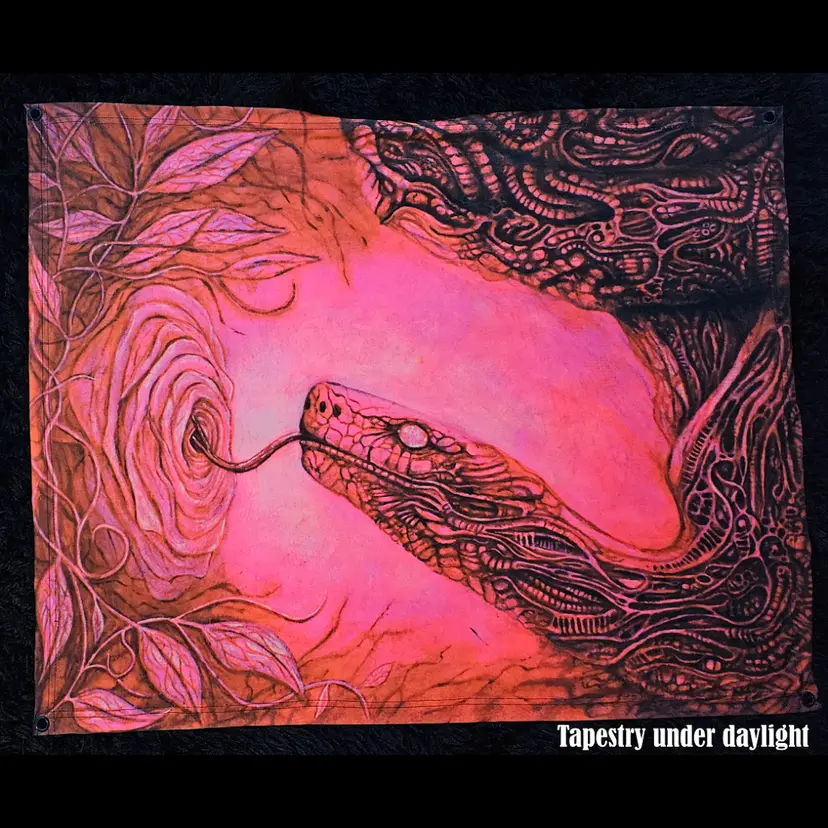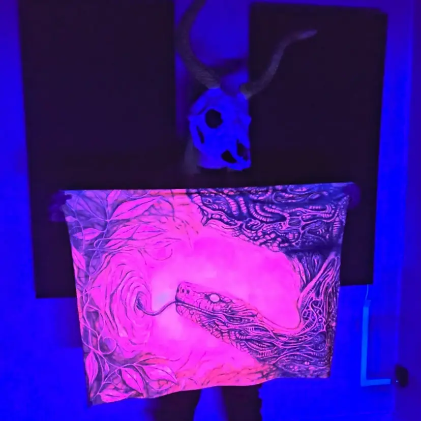 Made from high-quality lycra fabric, the tapestry features a soft matte finish with a slight stretch, ensuring durability and wrinkle-free look. Printed with UV-reactive inks, the artwork glows under black light, revealing hidden details and giving the piece a mesmerizing, trippy 3D effect that comes alive in the dark.