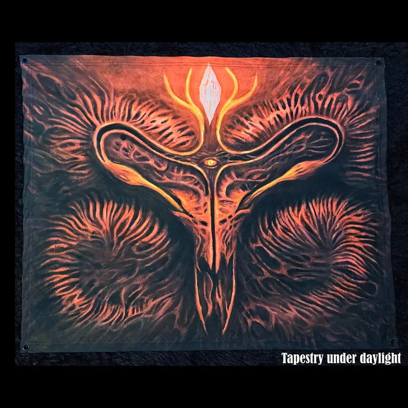 Made from high-quality lycra fabric, the tapestry features a soft matte finish with a slight stretch, ensuring durability and wrinkle-free look. Printed with UV-reactive inks, the artwork glows under black light, revealing hidden details and giving the piece a mesmerizing, trippy 3D effect that comes alive in the dark.