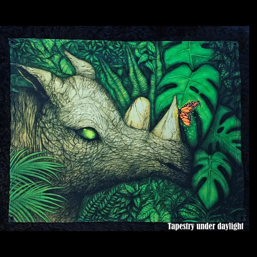 Made from high-quality lycra fabric, the tapestry features a soft matte finish with a slight stretch, ensuring durability and wrinkle-free look. Printed with UV-reactive inks, the artwork glows under black light, revealing hidden details and giving the piece a mesmerizing, trippy 3D effect that comes alive in the dark.