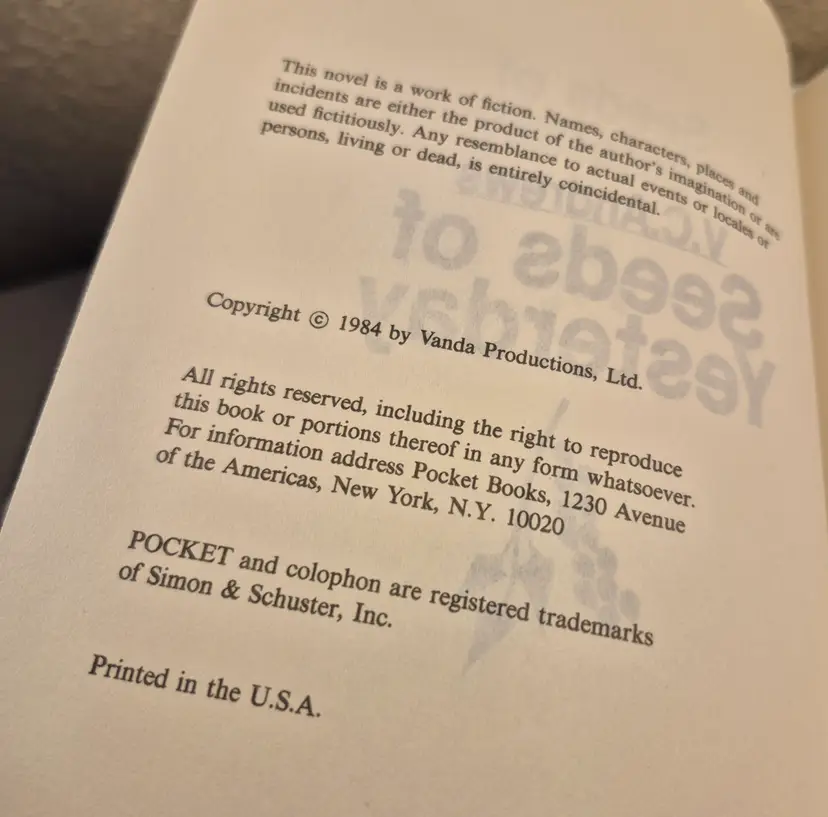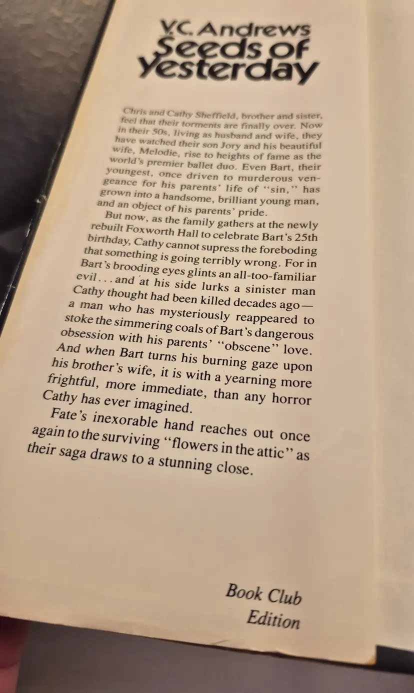 V. C. Andrews 1984 Seeds of Yesterday Hardback w/Jacket Book Club Edition The dust jacket has several dings but the book itself is in great condition. Comes from a clean and smoke free environment Thank you for visiting my page!