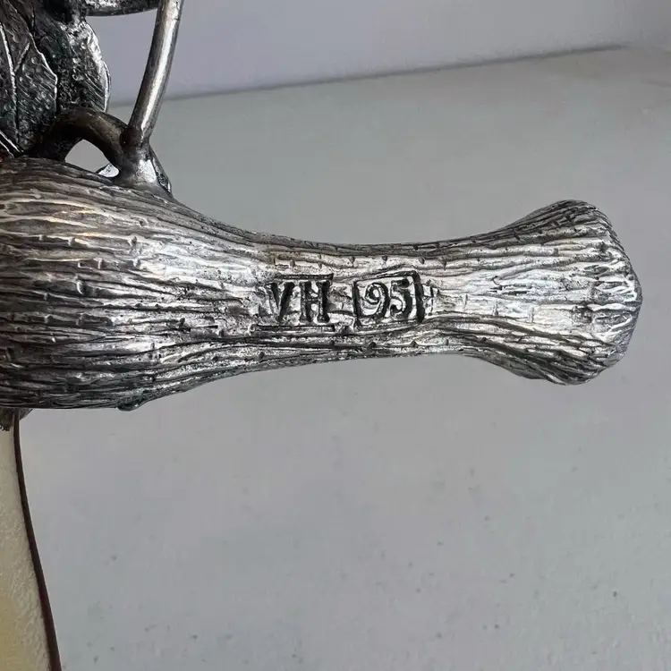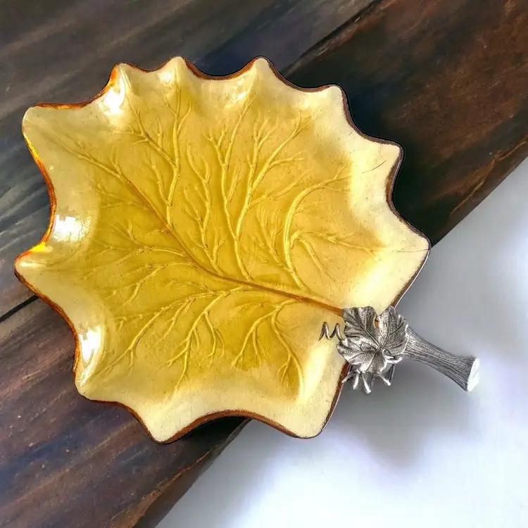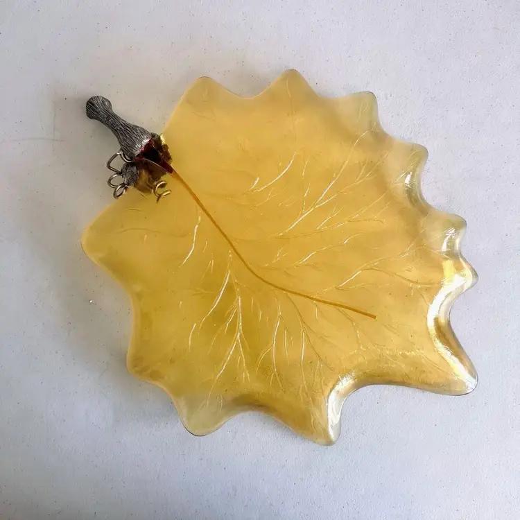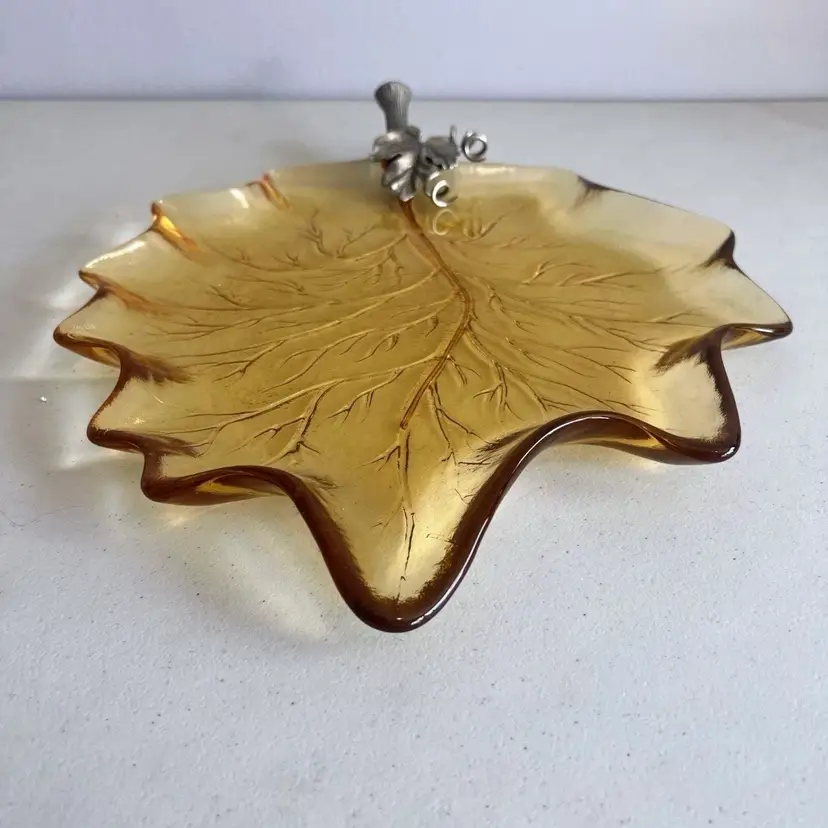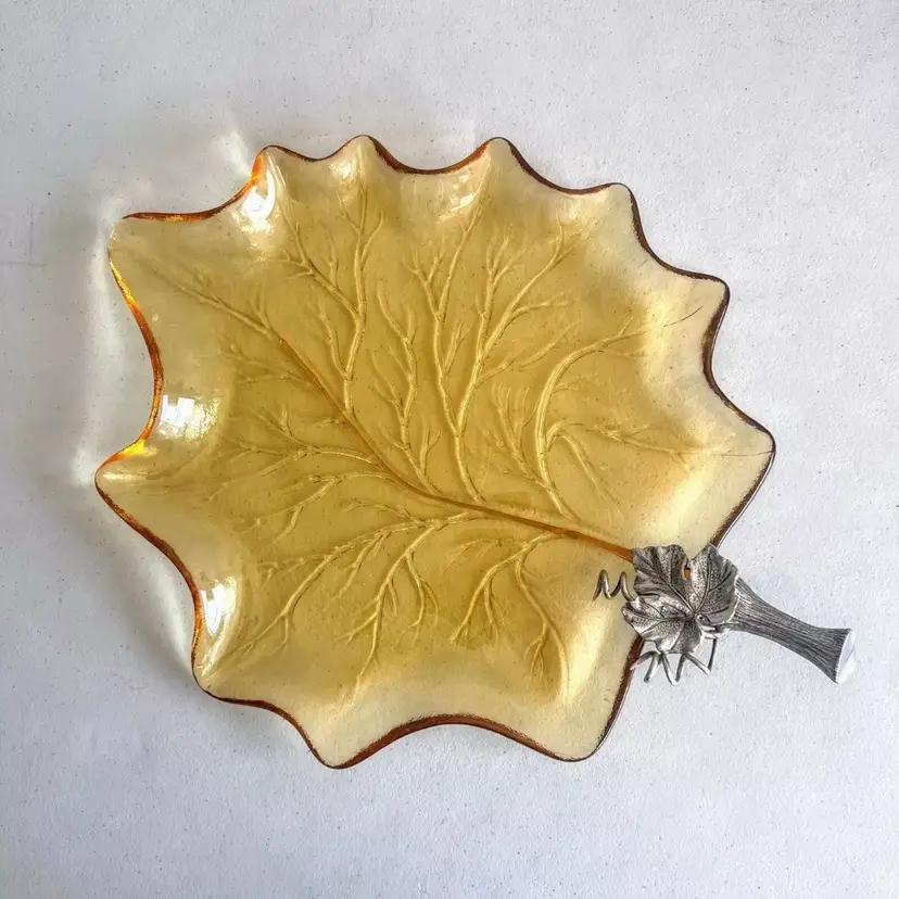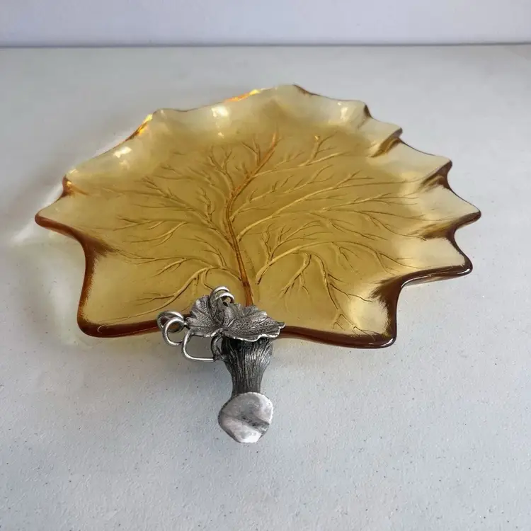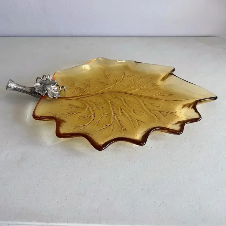 Here We Have a Vagabond House Amber Glass Leaf Serving Platter and Pewter Handle VH 95