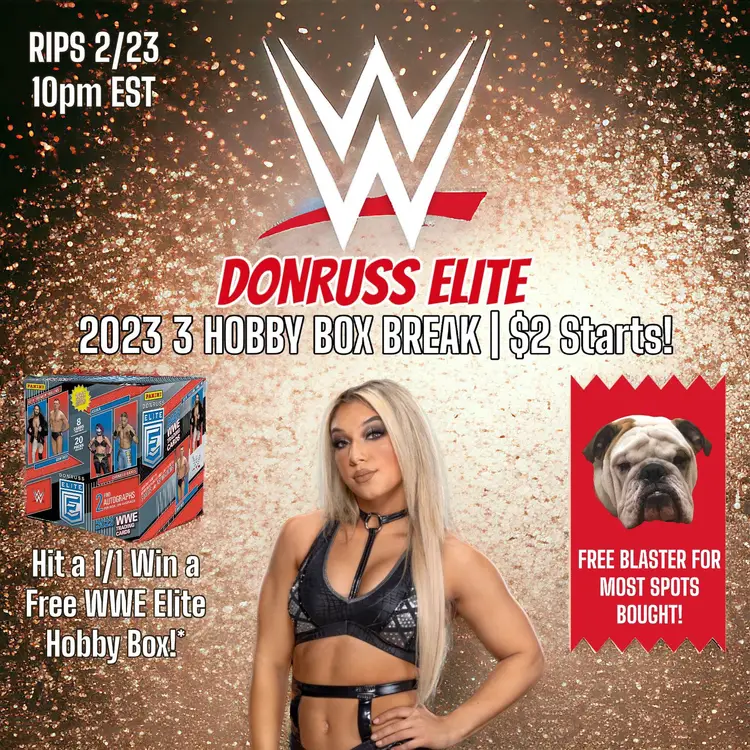 You are bidding on all the cards of the WRESTLER listed in the title in this 3x Hobby Box rip of WWE Donruss Elite 2023 wrestling cards. All 3 Boxes will be opened LIVE after auctions end on Friday, 2/23/2024, at apx 10 PM Eastern / 7 PM Pacific. Opening will be viewable & simulcast on the Schway Nostalgia District as well as on Twitter, X/Twitch, YouTube and our Facebook Group! US Shipping: $4.50 for 1st spot won; only $.25 for any subsequent spots you win. Any spot won where no cards of the wrestler are found in the box will receive a wrestling card from my personal collection. Any dual, multi-wrestler, or other Wild Card pulled that does not apply to a wrestler spot listed will be assigned by draw between all participants.
