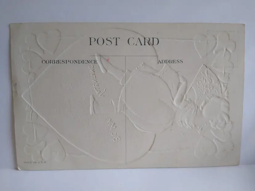 Antique original vintage embossed post card. Has side to side lower creases, corner creases, and age wear. Non posted. Stock #val57.
