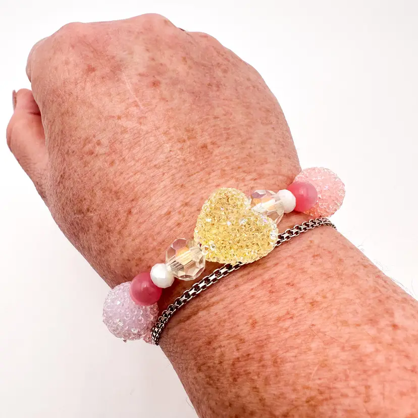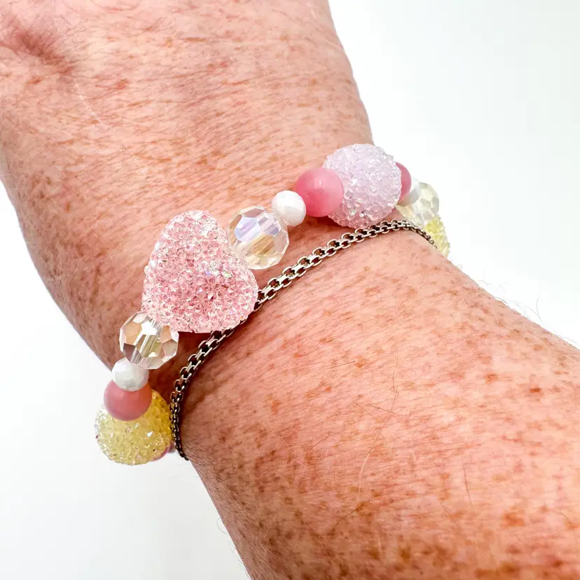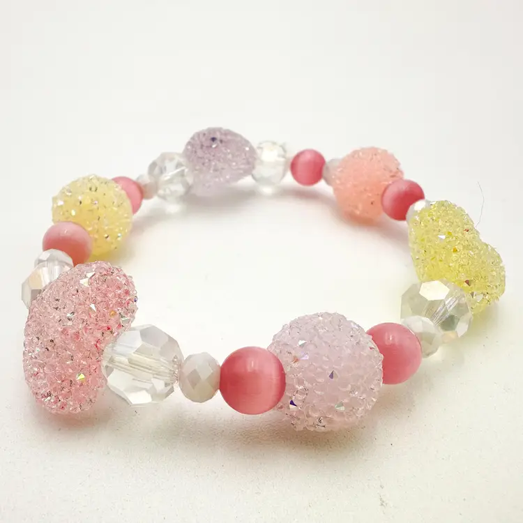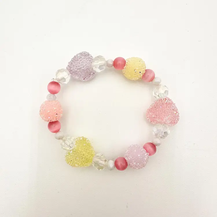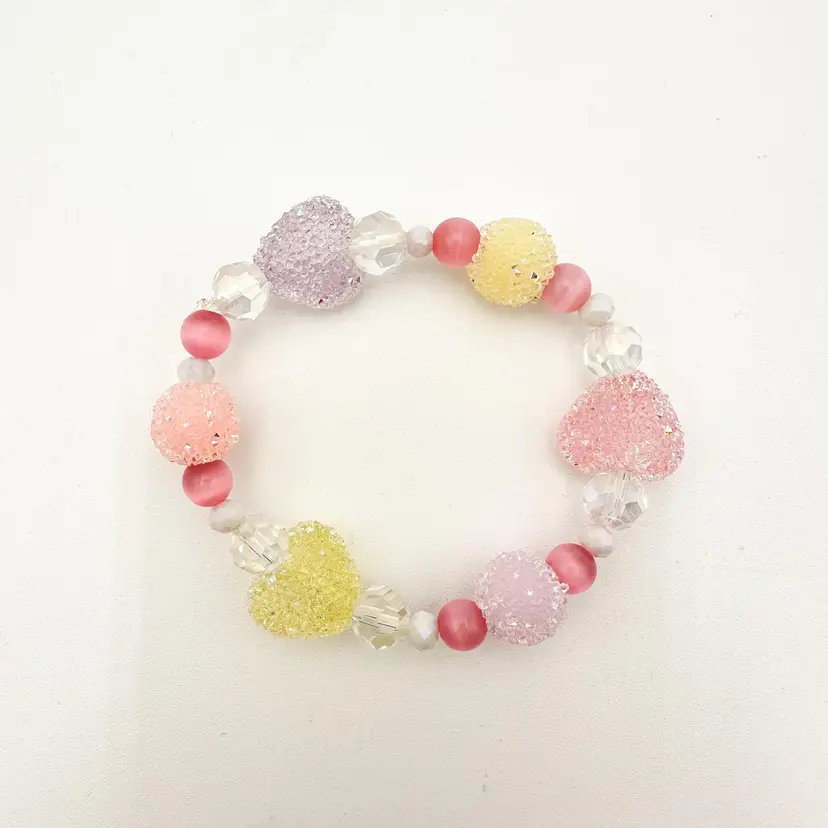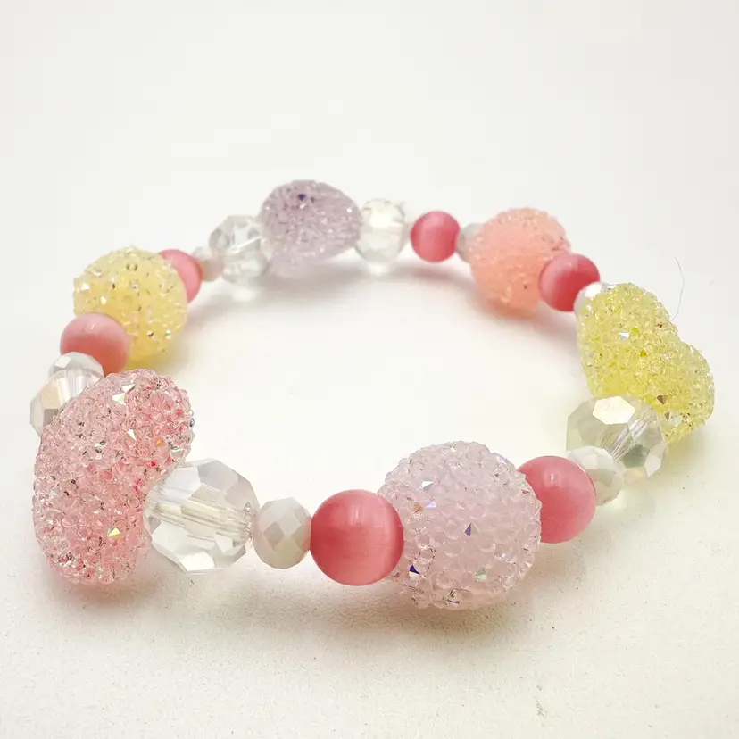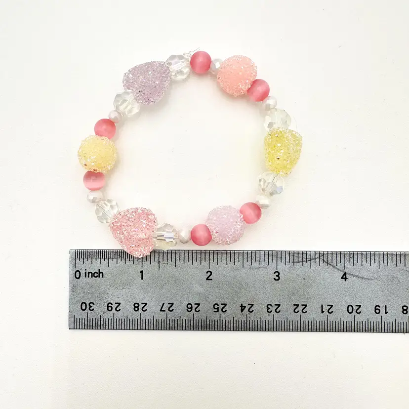 Features "sugared" look heart and round shaped beads in pastel pink, purple and yellow with pink glass cat's eye and AB faceted crystal beads on a clear stretch cord Fits like a 7.5-8" New, handmade with new beads by me