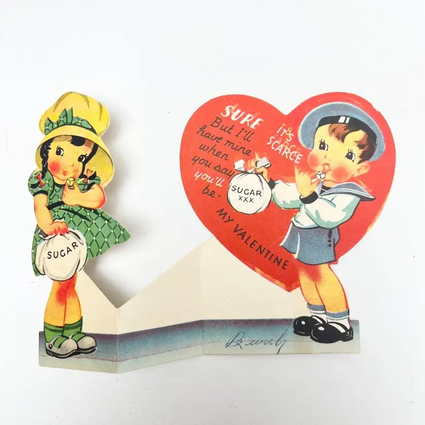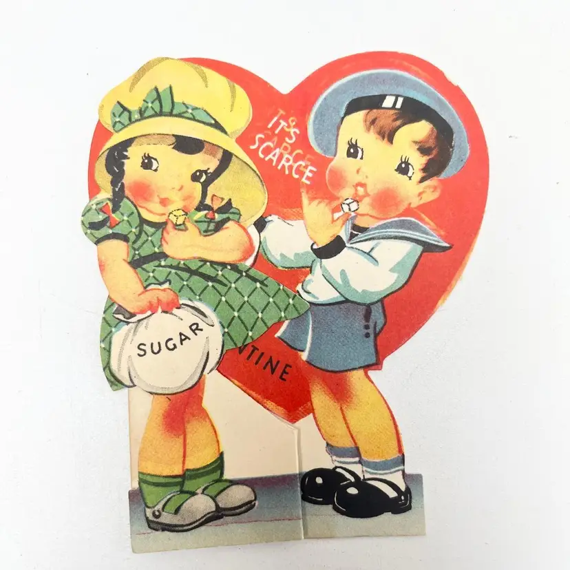Vintage Scarce Valentine Card Girl Sailor Boy WWII Ration 1940s Ephemera It's scarce... Sure, but I'll have mine when you say you'll be my Valentine Dated 1947 A-Meri-Card P-114 Made in USA Condition: Used. Wear around the edges and on the corners. The back side is toned, discolored and has album residue. Measures 4 inches x 3-1/4 inches Packaged in a plastic sleeve inside a rigid envelope Visit my store to see more vintage ephemera, advertising, novelties, gifts, estate sale and yard sale finds https://district.net/u/finderspickerspaper SKU Holiday