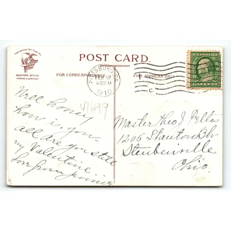 Posted with 1910 cancel. Antique original vintage post card. Has corner dings and age wear. Stock #val98.