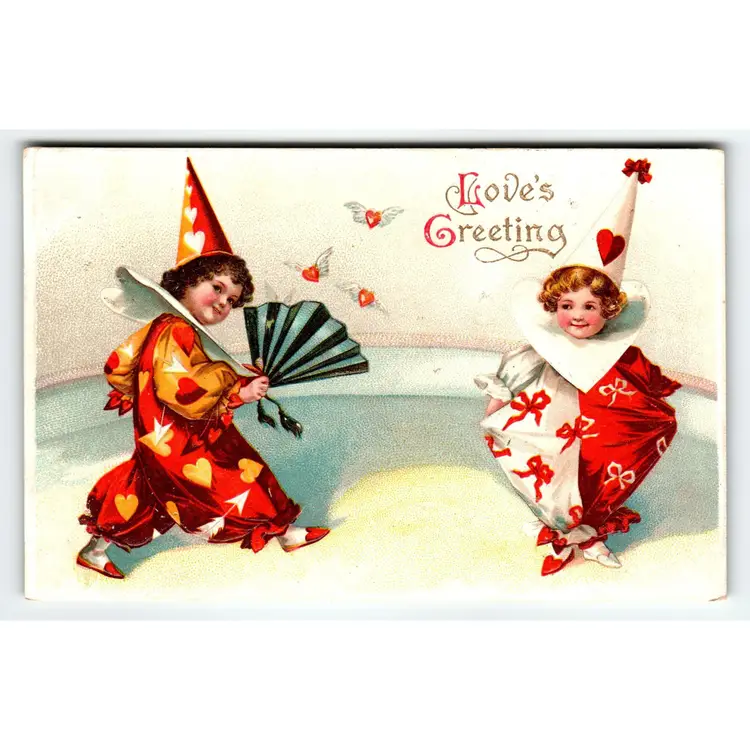 This vintage postcard features a charming scene of two child clowns, one holding a fan, against a fantasy background. The postcard is an original lithograph printed on paper and was manufactured in Germany in 1910. It has an embossed and divided back and has been posted, making it a unique addition to any collection. The postcard measures the standard size of 5.5 x 3.5 inches and is part of the Valentine's Day occasion theme. It is a single unit and features the work of artist Ellen Clapsaddle. The postcard is an authentic piece from the pre-war era and is perfect for collectors or those looking for a special Valentine's Day greeting.