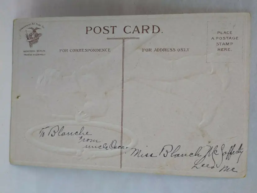 Vintage embossed Valentine postcard. Unsigned Ellen Clapsaddle art. Has pin hole top center, creases, and age wear. Writing on back but never posted. International Arts Publishing on back with printed in Germany. Stock #val25.