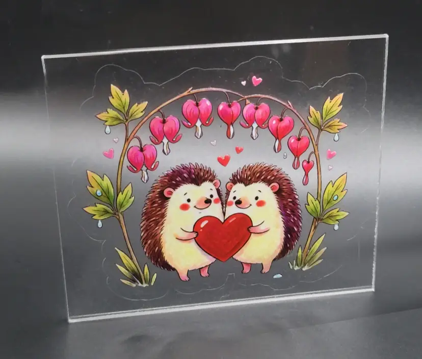 3.3"x2.75" window cling will come on a small piece of clear acrylic to protect it during shipping. Using just a small dab of water on the back of the cling before pressing it onto a window or mirror will help your cling adhere smoothly to the desired surface.