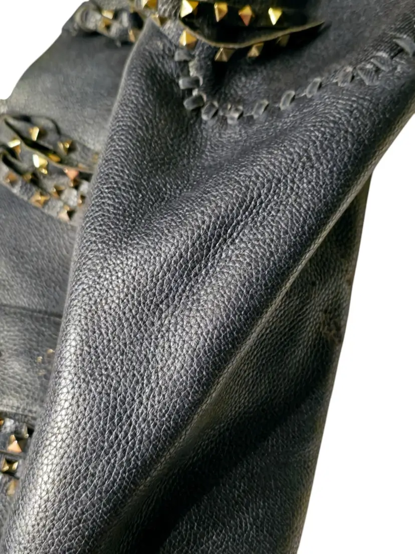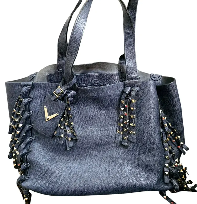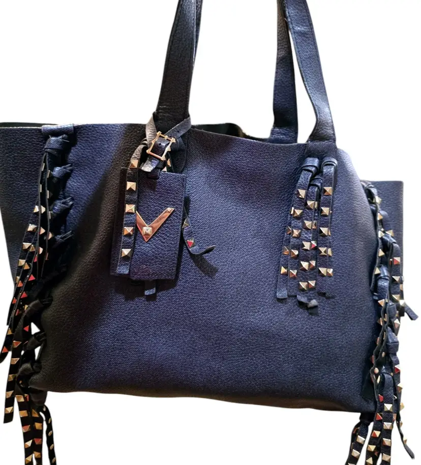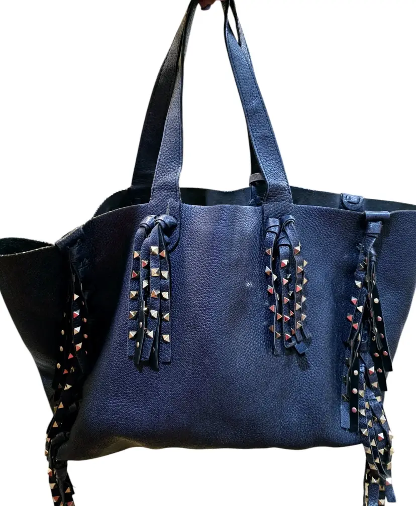 Valentino Denim Blue Leather Rockee Studded Fringe Tote/Shopper Bag (V1)