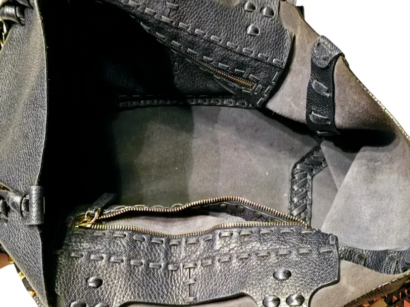 Details: It has some spots on the bottom, where Valentino was in gold. The gold Valentino is worn off. Some fringe edges curl up at the bottom. Handles have wear. Originally $4400 in 2010. No shoulder strap, 100% authentic.