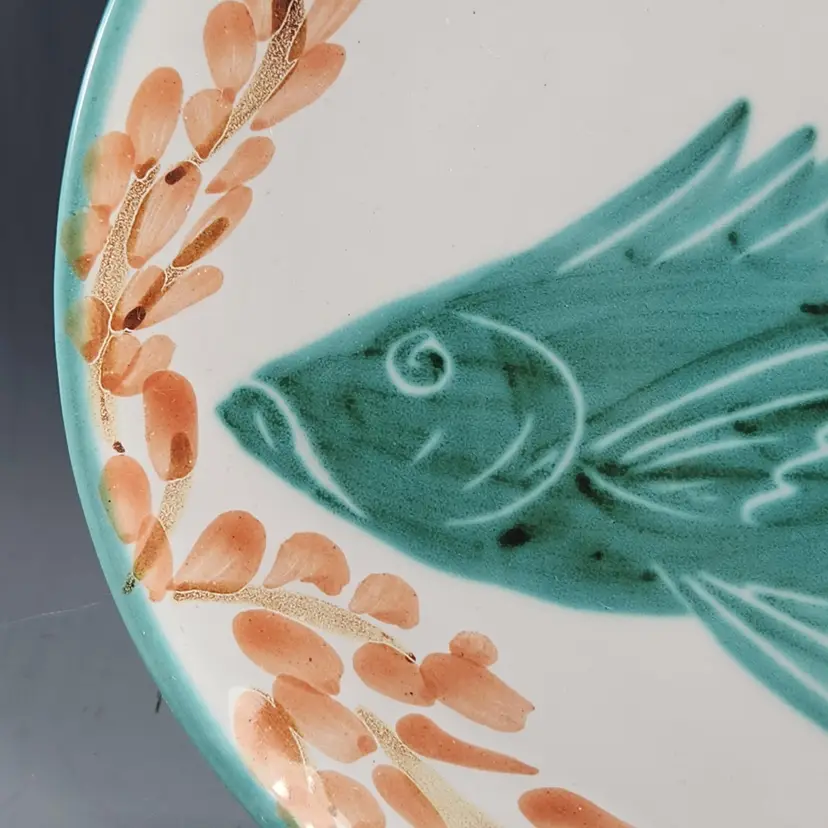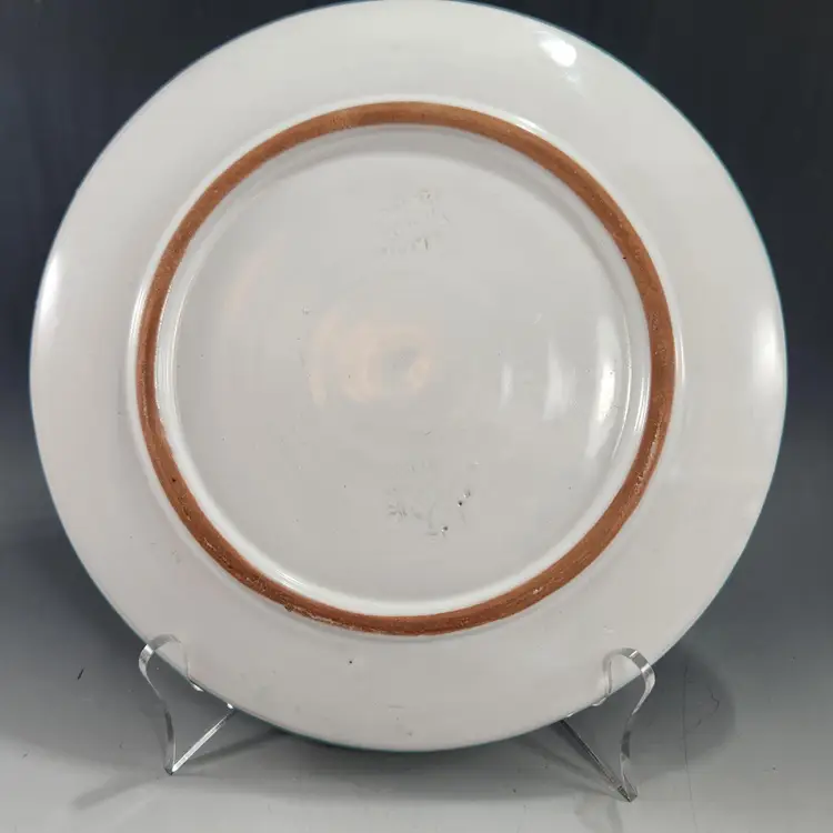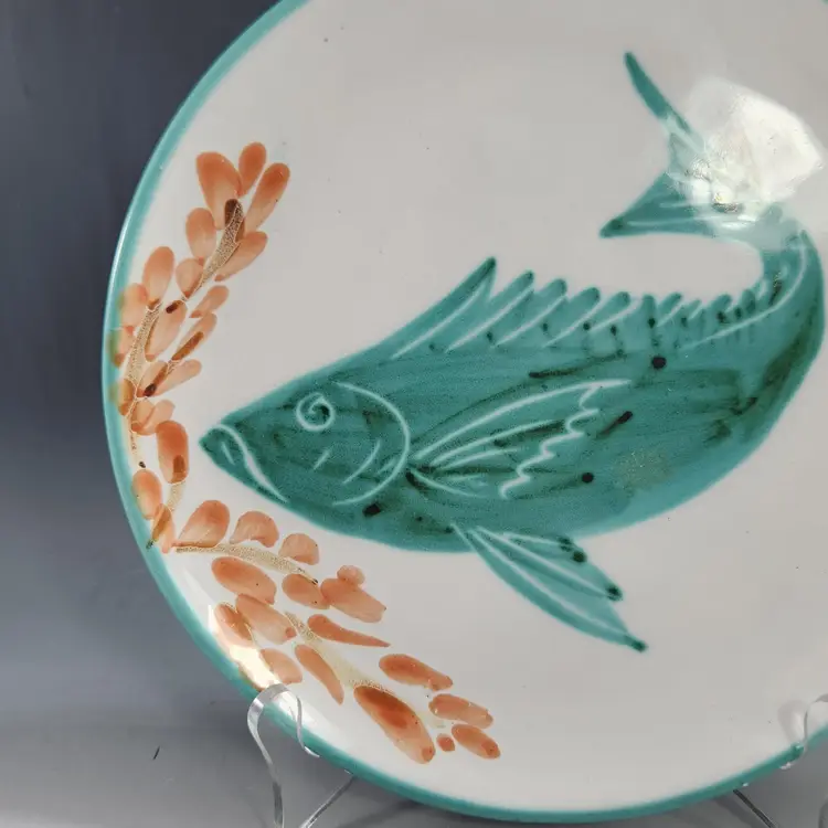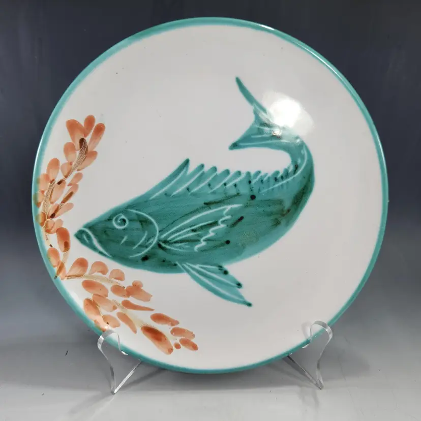 Hard to find one of a kind Vallauris redware pottery plate. Glazed and hand painted by sought after artisan potter Antoine Fazio & stamped by the artist on the back side. Also stamped with the SAP mark for the Syndicat des Artisans Potiers, a group of potters who made pottery in the Vallauris region (SE France.) This versatile plate would be perfect for anything from a farmhouse to beach style home. Place tabletop on a stand or add to a gallery wall. Made mid century.