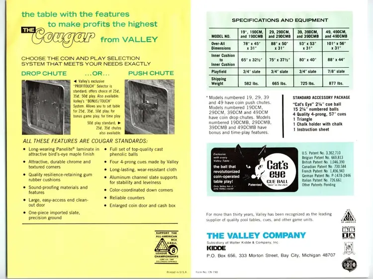 Brand: Valley Year: Unknown Game Title: Cougar Original/Reproduction: Original Country/Region of Manufacture: United States Arcade: Flyer