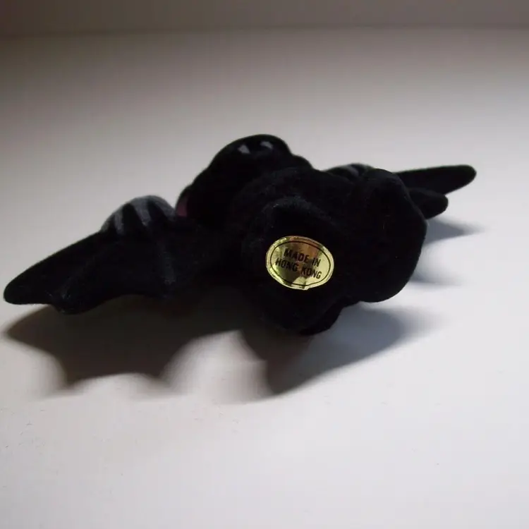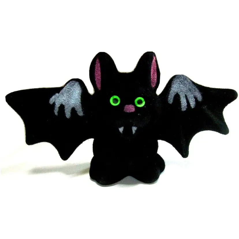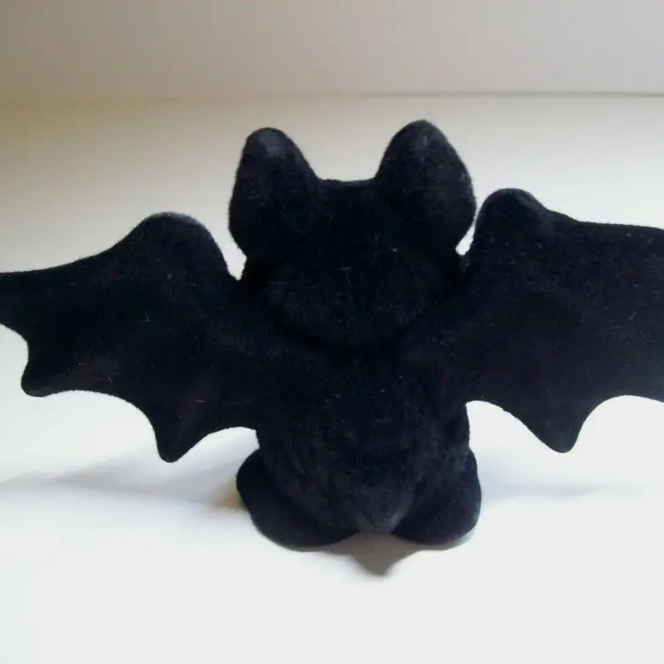 Vintage Halloween vampire bat toy. This is a old new old stock flocked fabric hard toy decoration. These were found in original plastic bags and stapled together. Tag on base reads "Hong Kong". Cute and collectible. Great gift idea. 4.25" x 2.5" x 1". Orders are shipped with care.