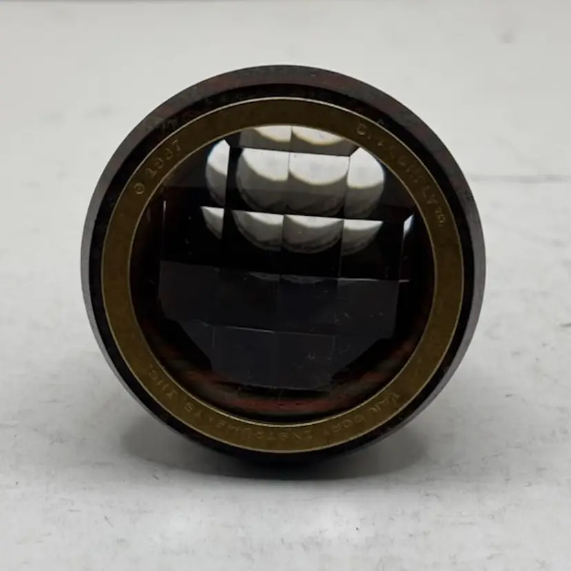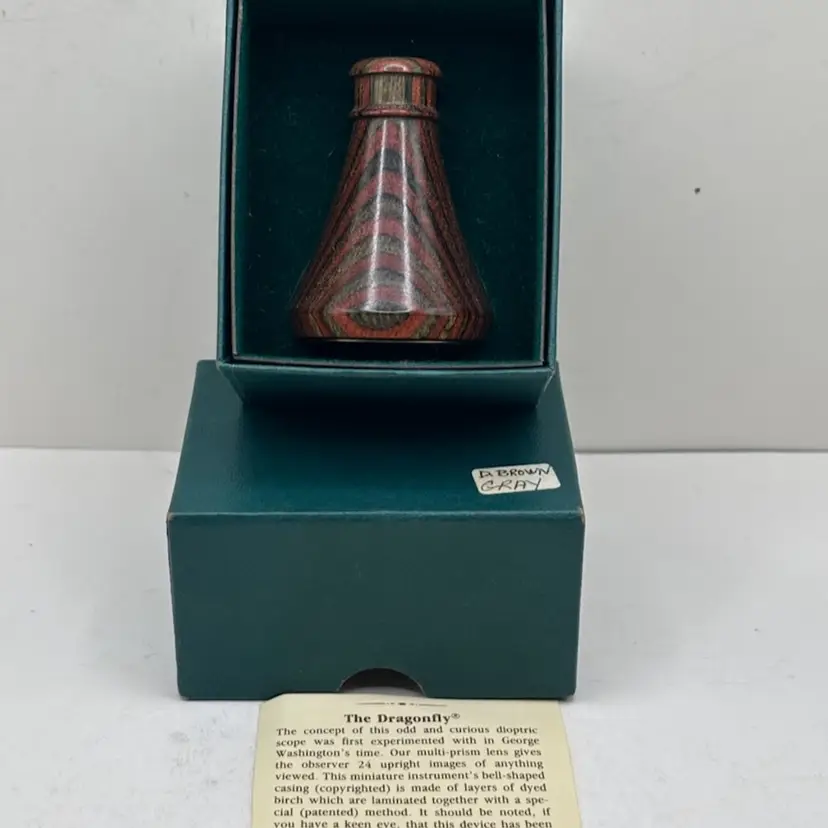 Multi-prism lens made of wood, brass and glass. The brass lens is signed and dated. Original box and information paper. A cool gift for Christmas! 2.25” tall Made in 1988.