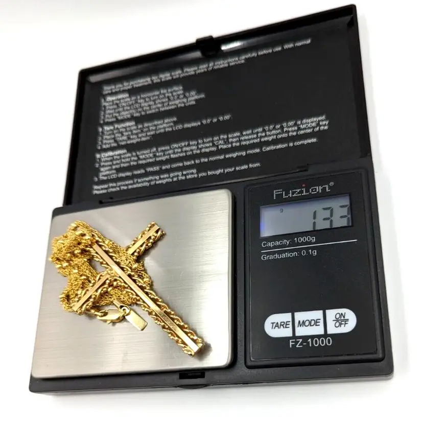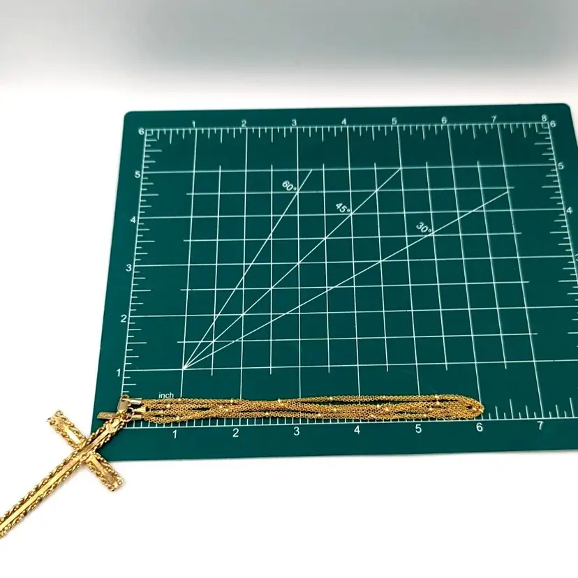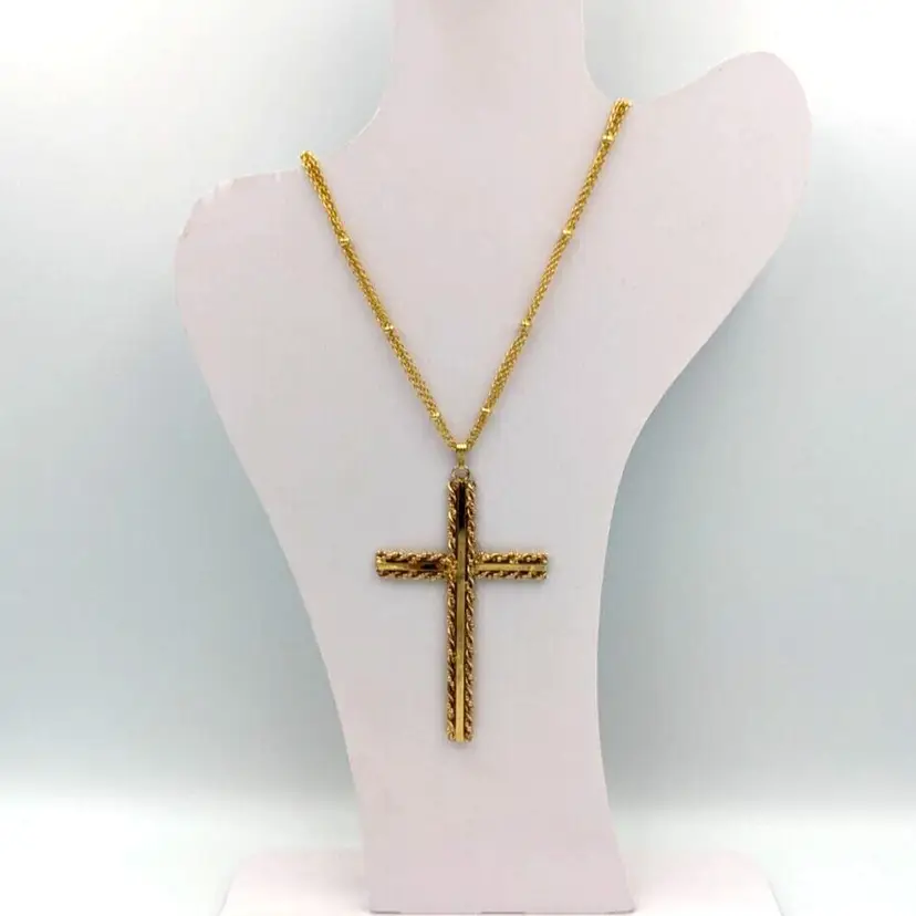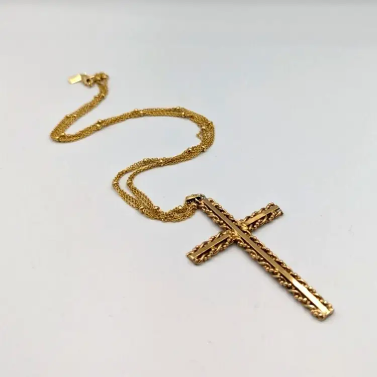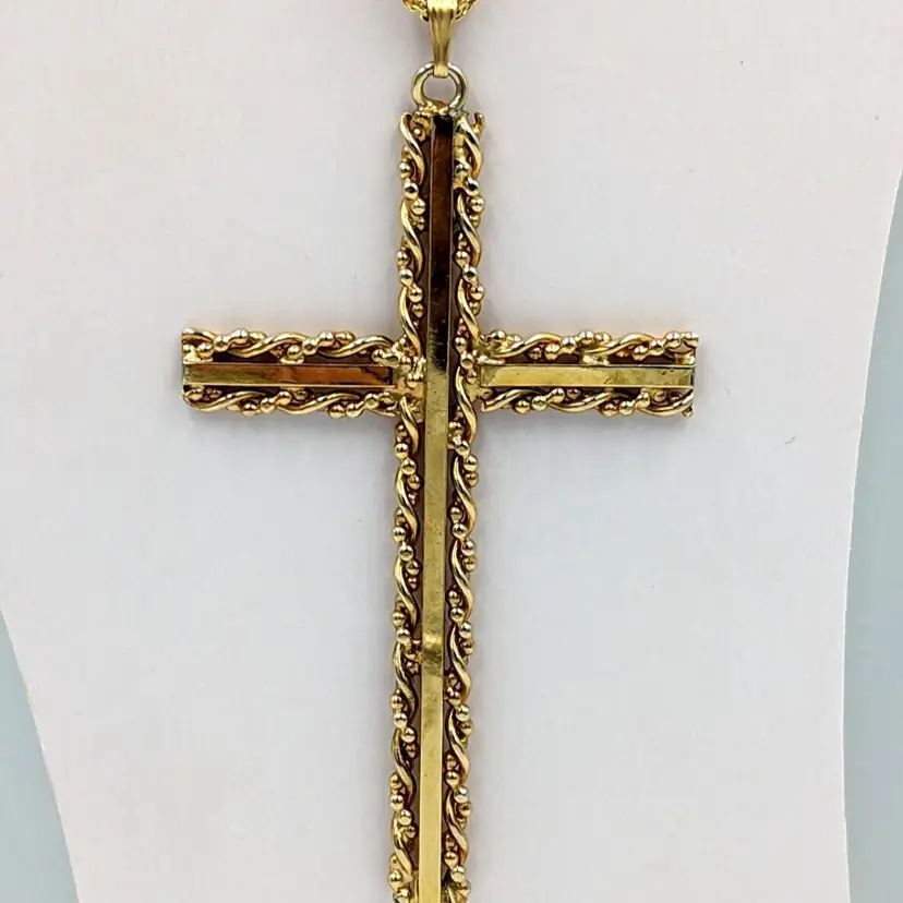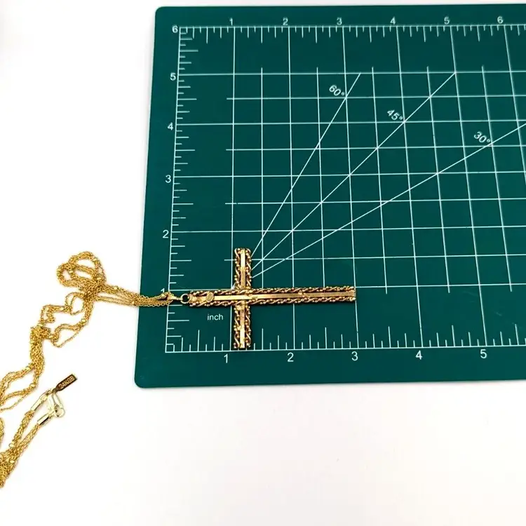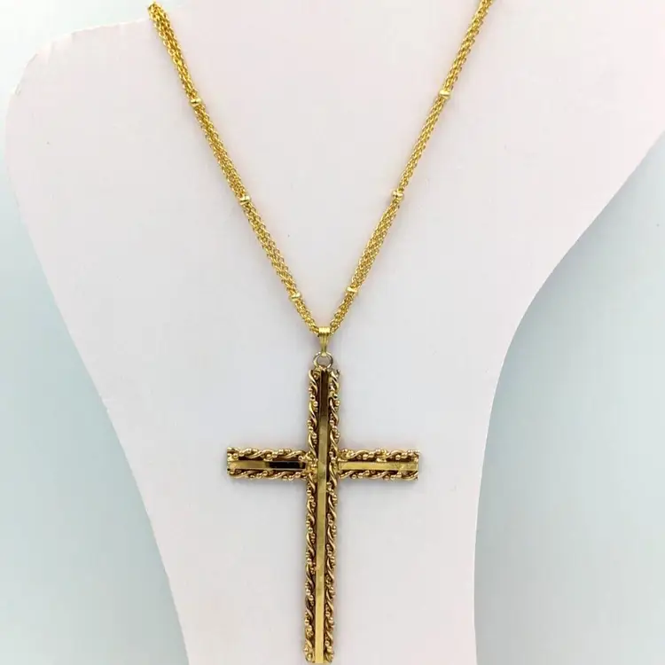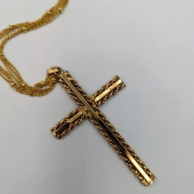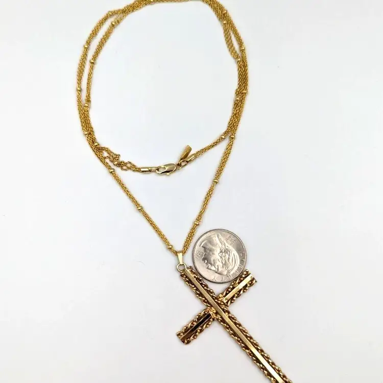 Van Lou 12K Gold Filled Statement Cross On Multistrand Oval Link 24K Gold Bond Chain Chain is 24" long, Cross is 3" x 1.75" 13.3 grams total weight Good vintage condition