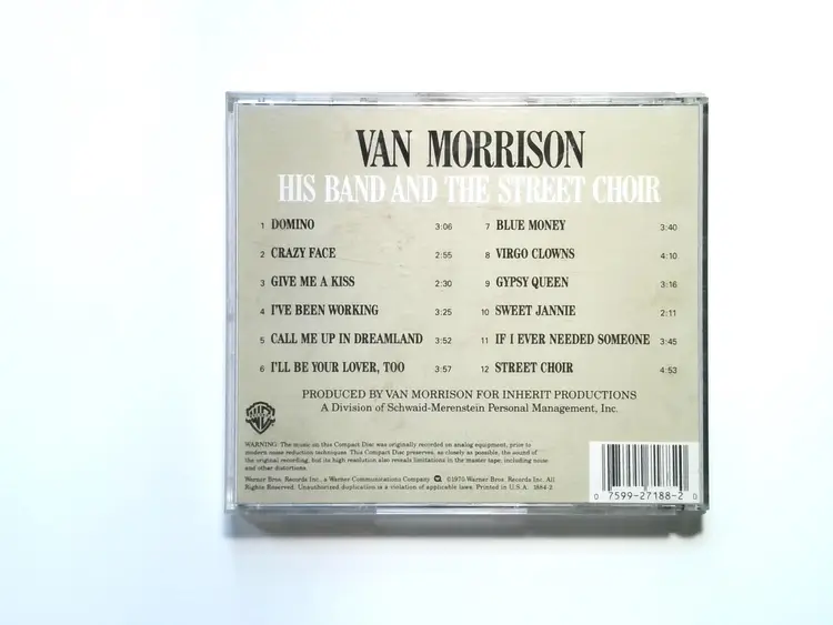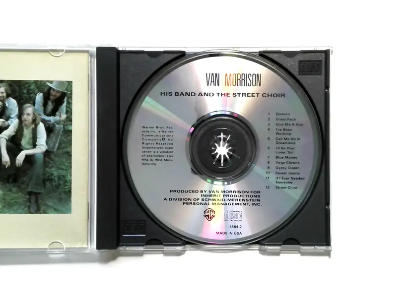 This is an early US CD pressing of "His Band and the Street Choir" from Warner Bros. Records, identifiable by the catalog number 1884-2 and the "MADE IN USA" notation on the disc. The back cover notes that the music was "originally recorded on analog equipment, prior to modern remastering techniques," ensuring an authentic listening experience true to its original sound. Produced by Van Morrison for Inherit Productions, this edition captures the raw energy and heartfelt lyricism that define his work, making it a valuable addition for collectors and new listeners alike. Experience the rich tapestry of sounds and emotions from one of music's most enduring figures.