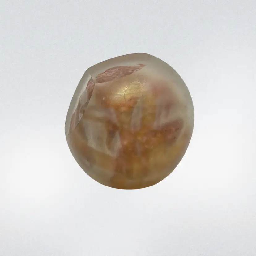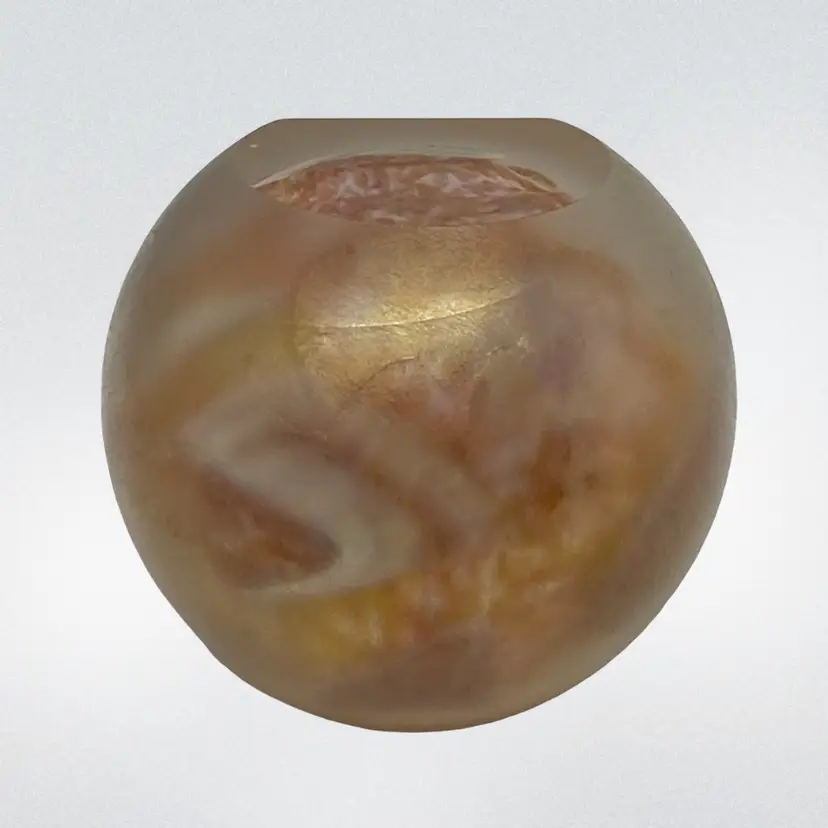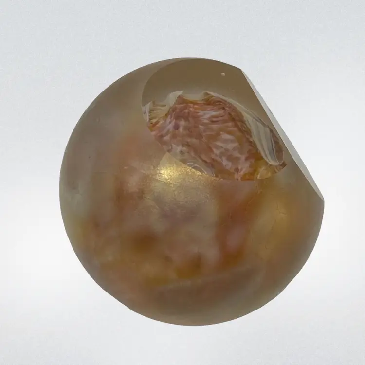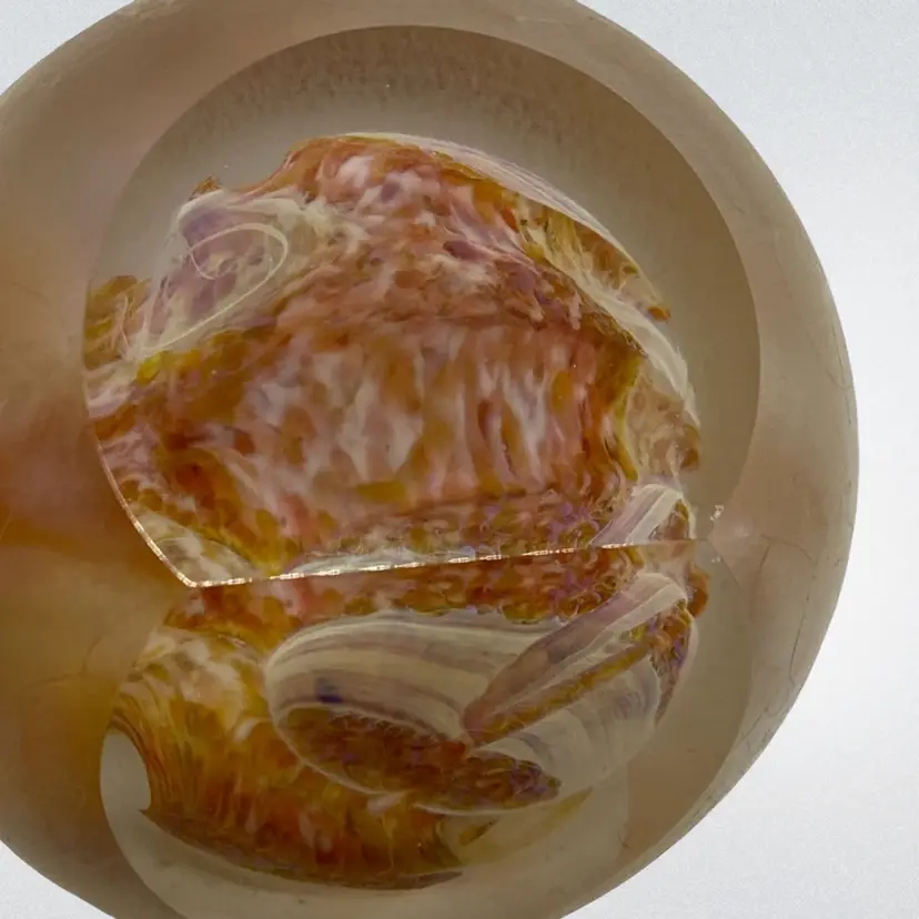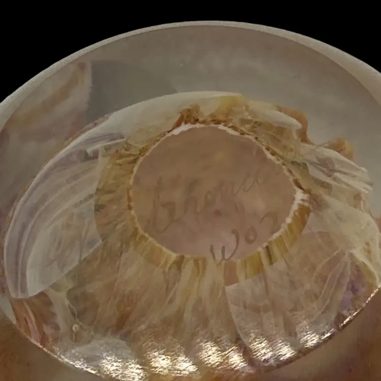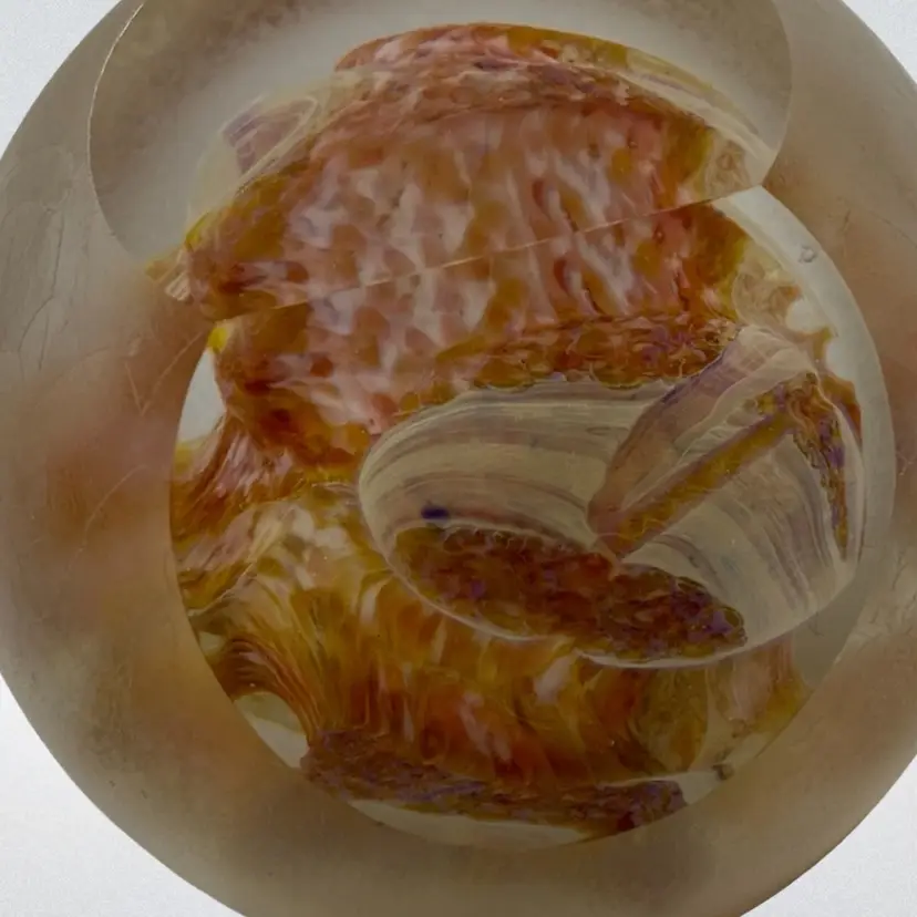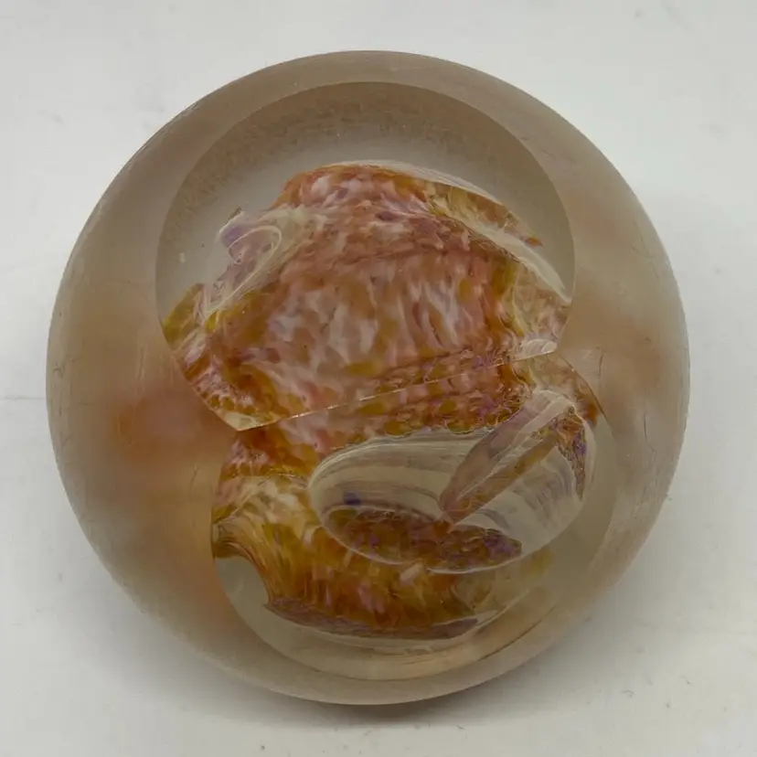 This is a Vandermark paperweight in excellent condition/no damage. The outside has a frosty iridescence and there are 2 windows cut into the piece. The inside looks like a chunk of coral. It measures approximately 2” high and 2.5” wide and is marked “Vandermark MW 02R”.