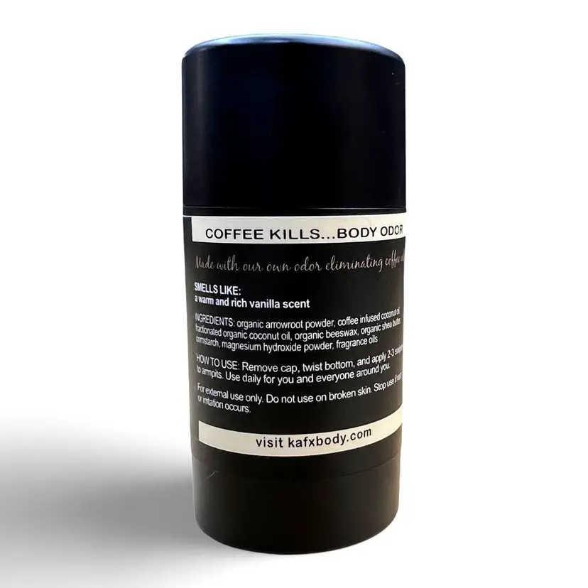 3 Pack Bundle of Vanilla Bean and Save! VANILLA BEAN - COFFEE INFUSED DEODORANT - NOW BAKING SODA FREE! SMELLS LIKE: warm and rich vanilla scent, not very sweet CONTAINS ZERO: ALUMINUM, PARABENS, PHTHALATES, SULFATES, OR DYES Introducing our revolutionary coffee-infused natural deodorant, meticulously crafted to provide unparalleled odor control while prioritizing your health and wellness. What sets our deodorant apart is the transformative power of coffee oil, an exceptional ingredient known for its remarkable ability to eliminate body odor without relying on harmful chemicals. Coffee oil, with its potent antioxidant properties, not only enhances skin health by combating free radicals but also acts as a formidable odor eliminator when incorporated into our deodorant. By harnessing the benefits of this unique ingredient, we have created a deodorant that goes beyond conventional solutions, providing a truly exceptional and natural odor-controlling experience. As dedicated parents to triplet sons, we intimately understand the significance of using safe and natural products. That's why we developed this deodorant specifically for our own family. We wanted a reliable solution that would safeguard our sons' delicate skin during their active days without exposing them to harsh chemicals. Our gentle yet powerful natural deodorant effectively curbs odor throughout the day, ensuring you feel fresh and confident in any situation. Its enduring formula provides all-day protection, allowing you to embrace each moment without worries. With meticulously chosen natural ingredients and the infusion of coffee oil, our deodorant presents the ideal choice for those seeking a wholesome and efficacious alternative for odor control and skin health. Bid farewell to harmful chemicals and welcome a deodorant that genuinely cares for your skin. Embrace the transformative power of nature with our coffee-infused natural deodorant, and experience a new level of freshness and vitality. Trust us to deliver a product that not only meets your expectations but exceeds them, revolutionizing your daily routine with the power of natural ingredients. INGREDIENTS: organic arrowroot powder, coffee infused coconut oil,organic coconut oil, organic beeswax, organic shea butter, cornstarch, magnesium hydroxide powder, fragrance oil HOW TO USE: Remove cap, twist bottom, and apply 2-3 swipes to armpits or anywhere the body that you are looking to decrease body odor. Use daily for you and everyone around you. Our deodorant can withstand outside temperature of up to 90 degrees. If you live in an area that exceeds this temperature, your deodorant that may arrive melted. If that happens, place the deodorant in the refrigerator until it solidifies.