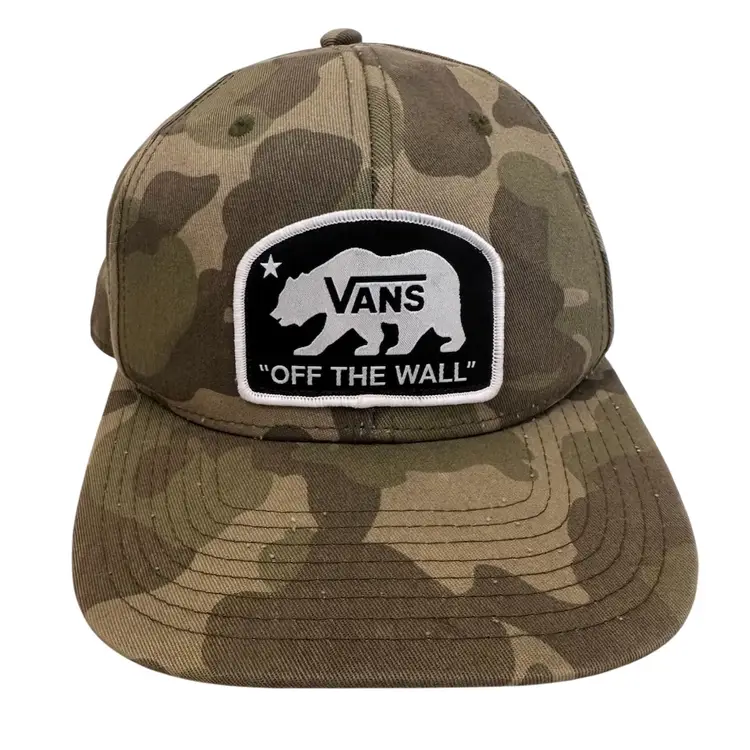 The VANS California Bear Logo Patch Camouflage Flat Brim Snapback is a stylish and versatile accessory suitable for various occasions. Made of cotton canvas material, this multicolor snapback features an adjustable design and is part of the Vans Off The Wall collection. The unique camouflage pattern and bear logo patch add a touch of personality to this unisex hat. Perfect for all seasons, this snapback is a must-have addition to any wardrobe.