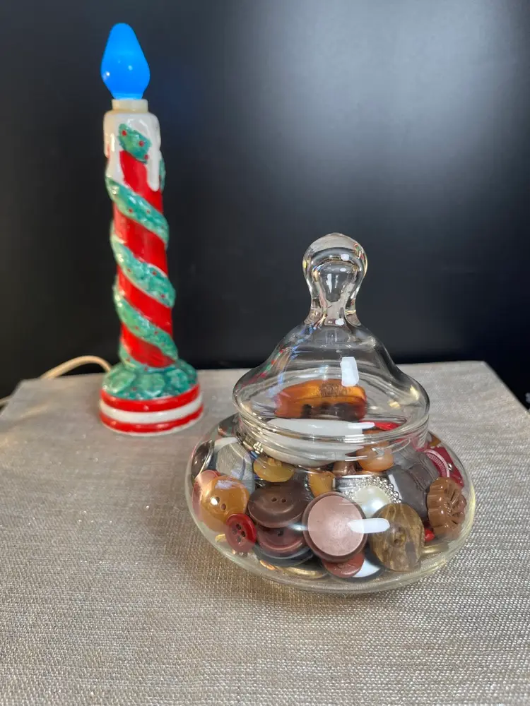 I believe most all of them are vintage. Nice variety. Almost 1 pound of button wonderfulness w/ a nice clear candy dish w/ lid. I will put buttons in a baggie and wrap the candy dish separately to prevent breakage. The dish measures approx 5"H, 4" Diameter at widest point, 1 Lb 2 Oz