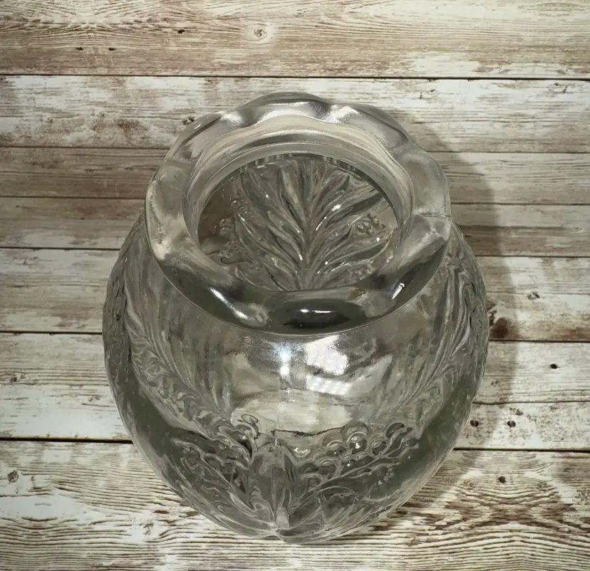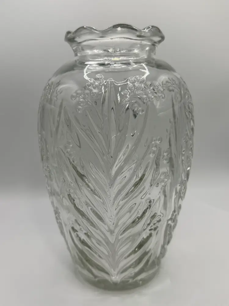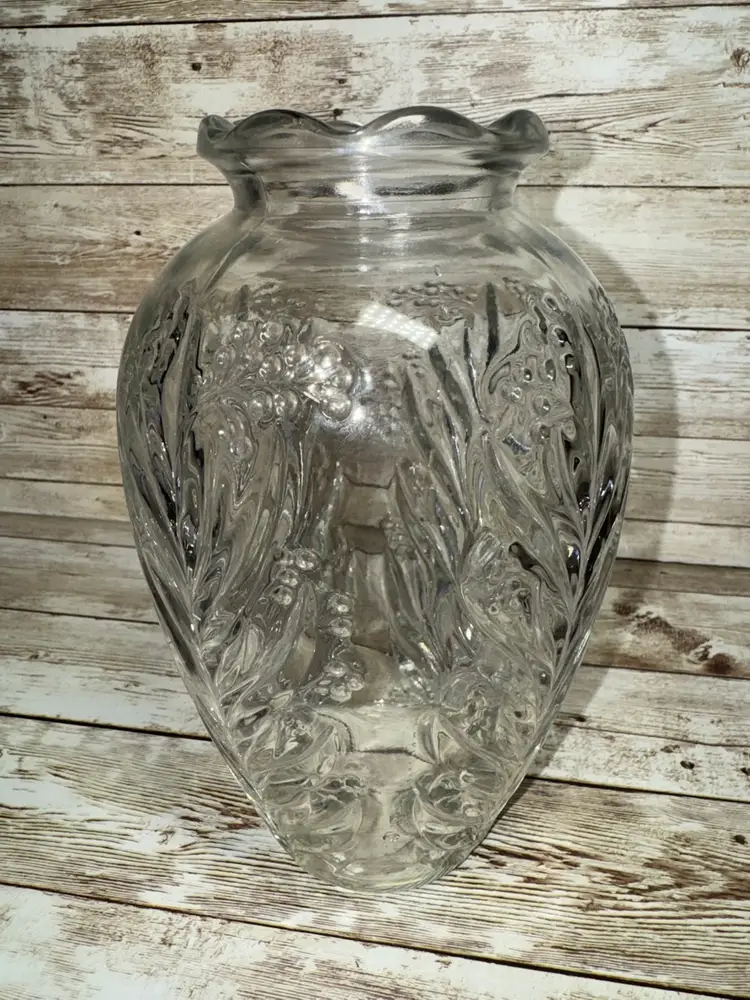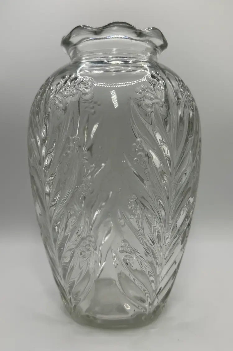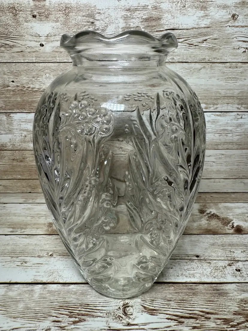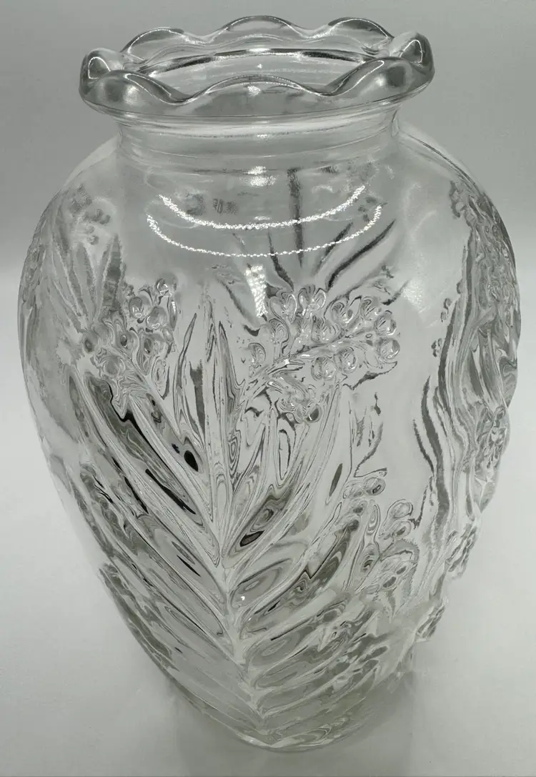 This vintage clear pressed glass vase with an embossed garden flower pattern and scalloped rim is a beautiful addition to any room. Made in the USA, this round vase stands at 8 inches tall and has a 2 1/2" diameter at the top. Its decorative design and theme of flowers make it a charming piece for displaying fresh or artificial blooms in a stylish and elegant way.