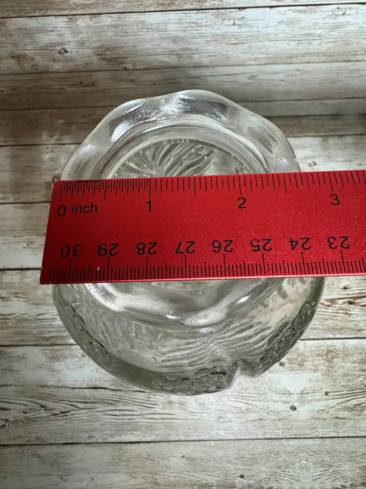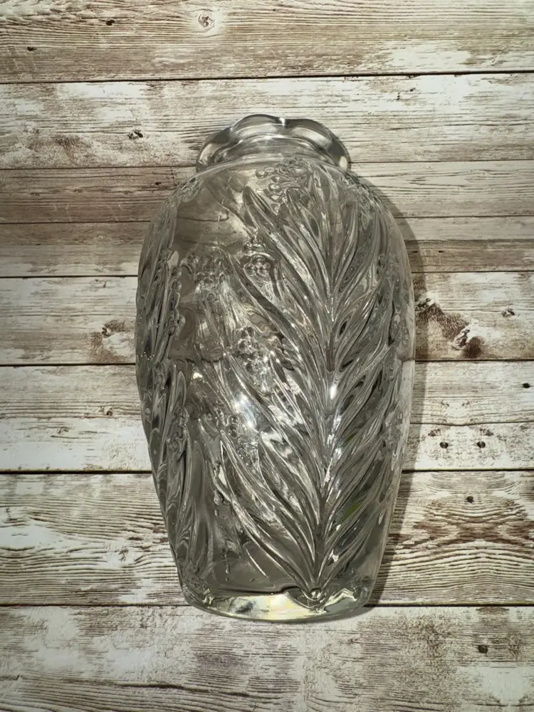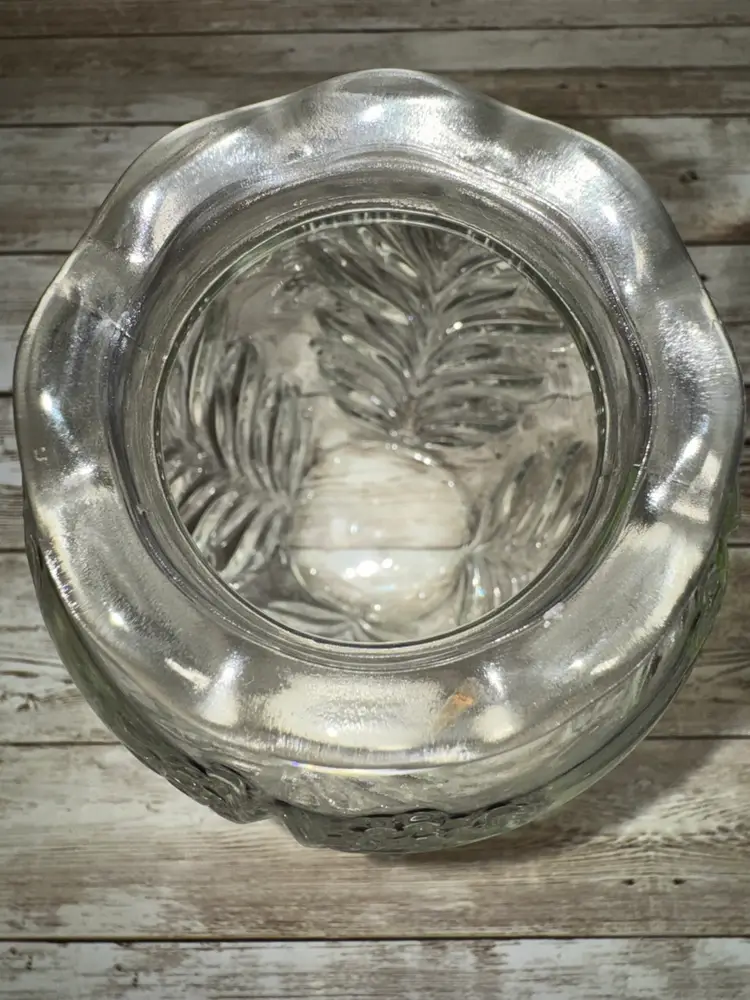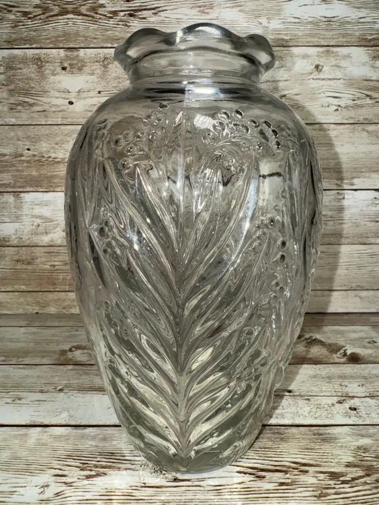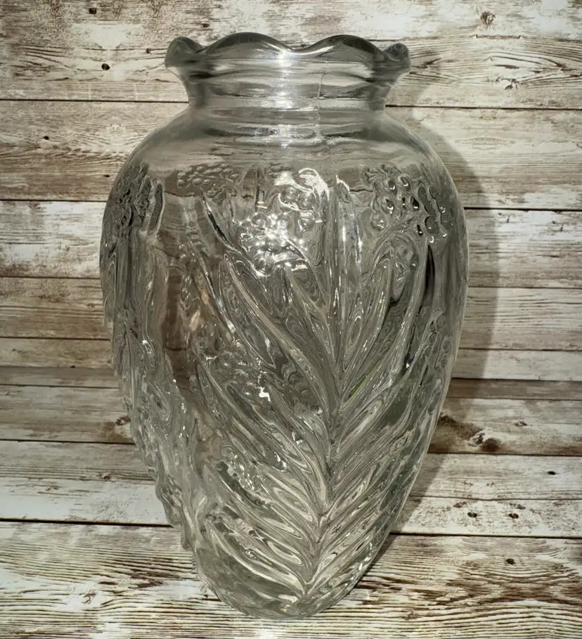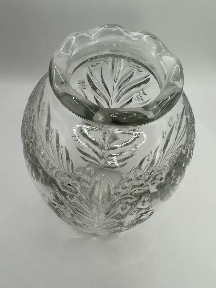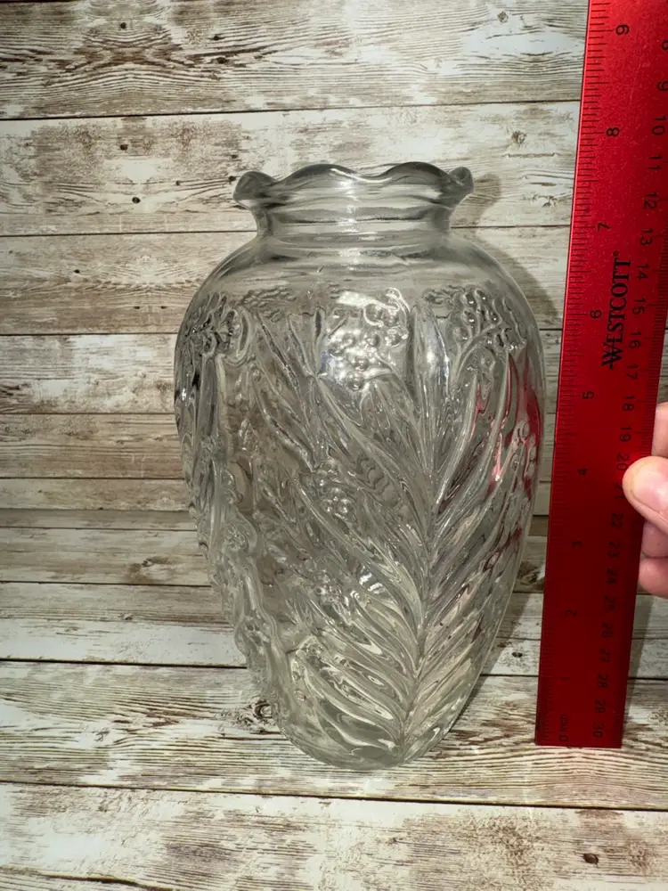 This vintage clear pressed glass vase with an embossed garden flower pattern and scalloped rim is a beautiful addition to any room. Made in the USA, this round vase stands at 8 inches tall and has a 2 1/2" diameter at the top. Its decorative design and theme of flowers make it a charming piece for displaying fresh or artificial blooms in a stylish and elegant way.