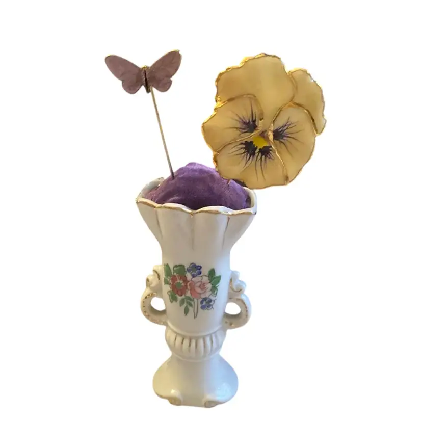 Ceramic vase is 4” x 2” Hatpins include a gold tone butterfly and a ceramic yellow pansy.