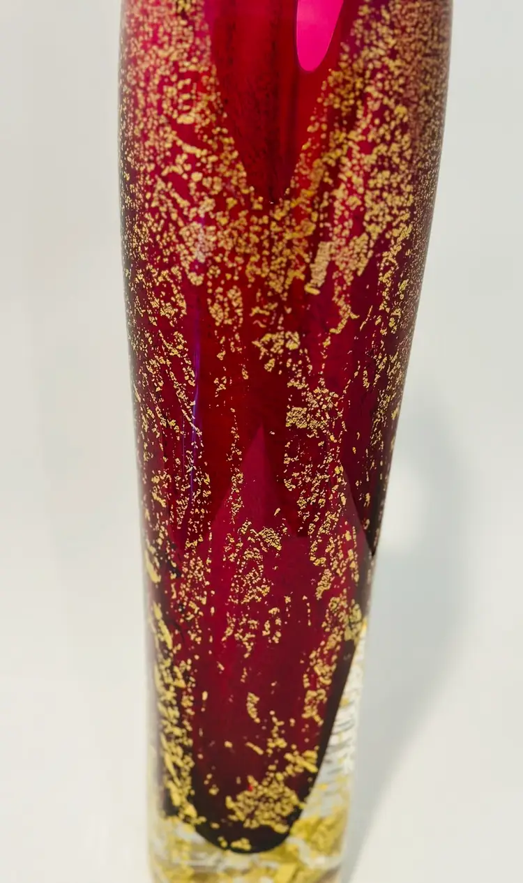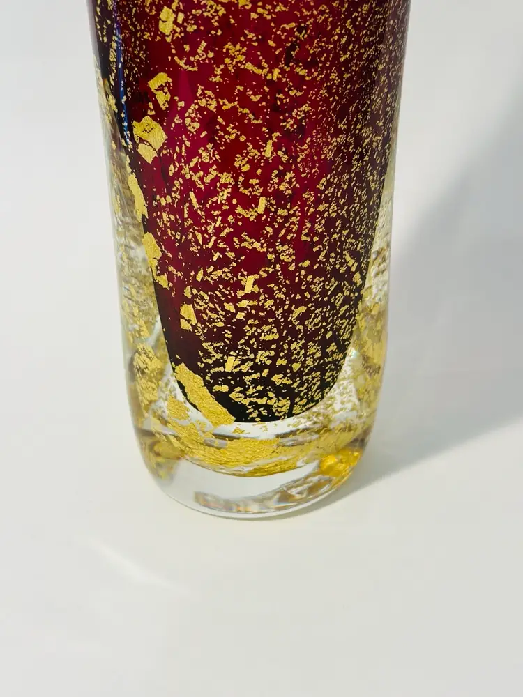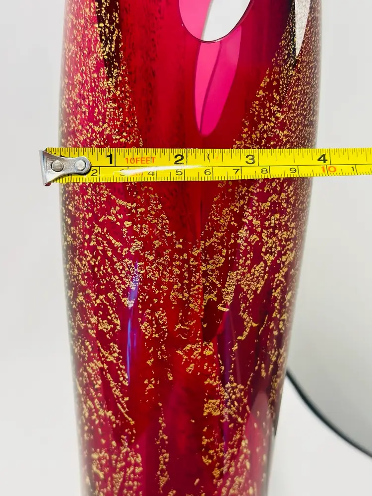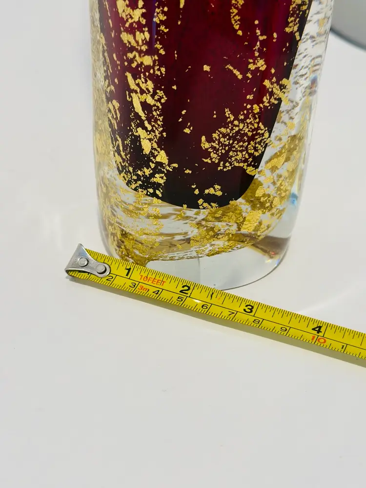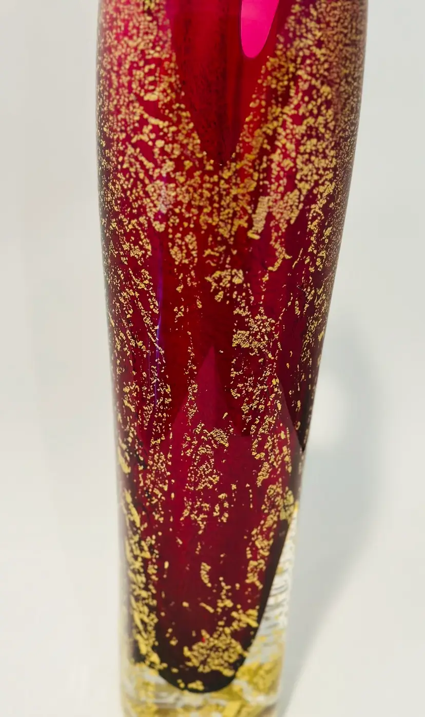 This vintage vase is a true masterpiece signed by Joseph W. Becker in 1997. The handblown glass is clear/cranberry color combination with gold fleck is made with an abstract pattern that is both modern and timeless. The gold fleck adds a touch of elegance to the piece, making it a perfect addition to any art glass collection.