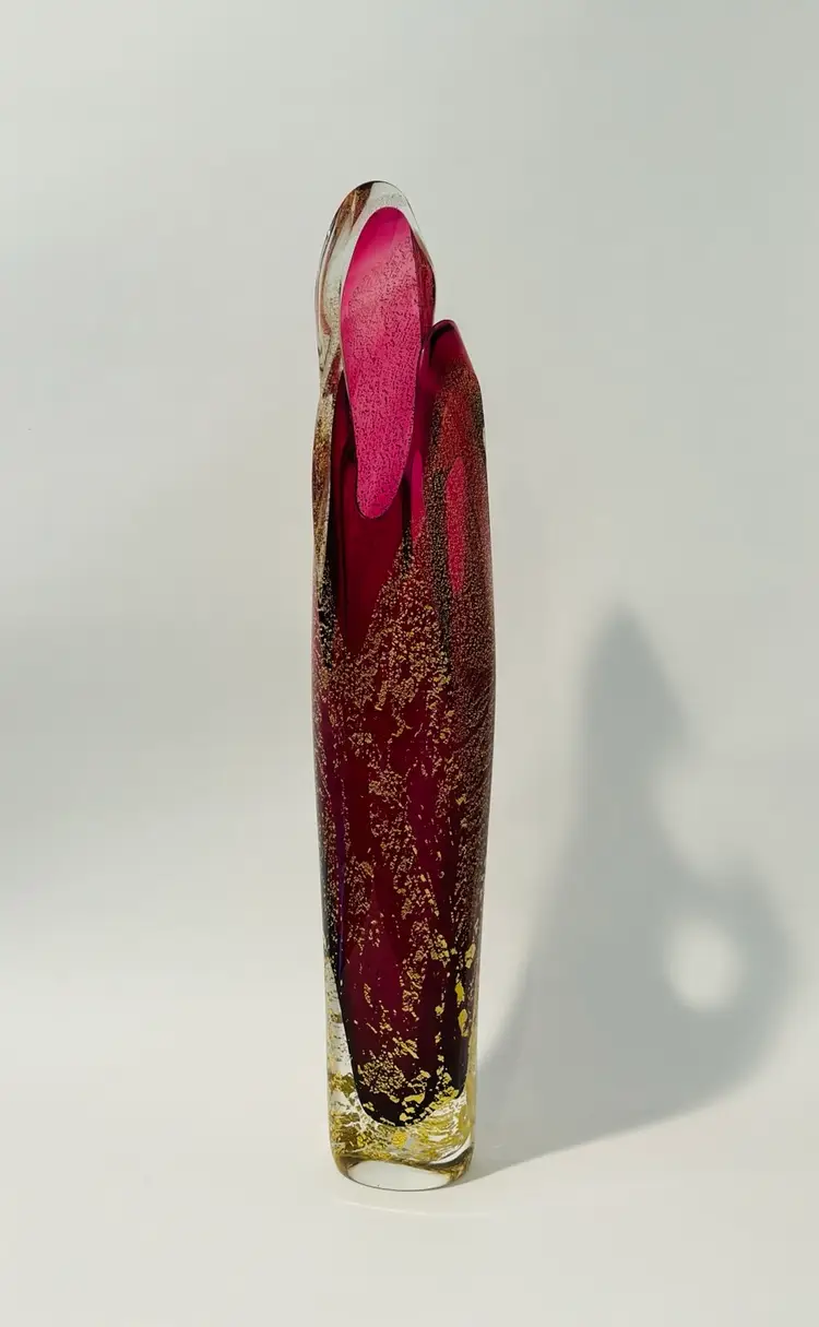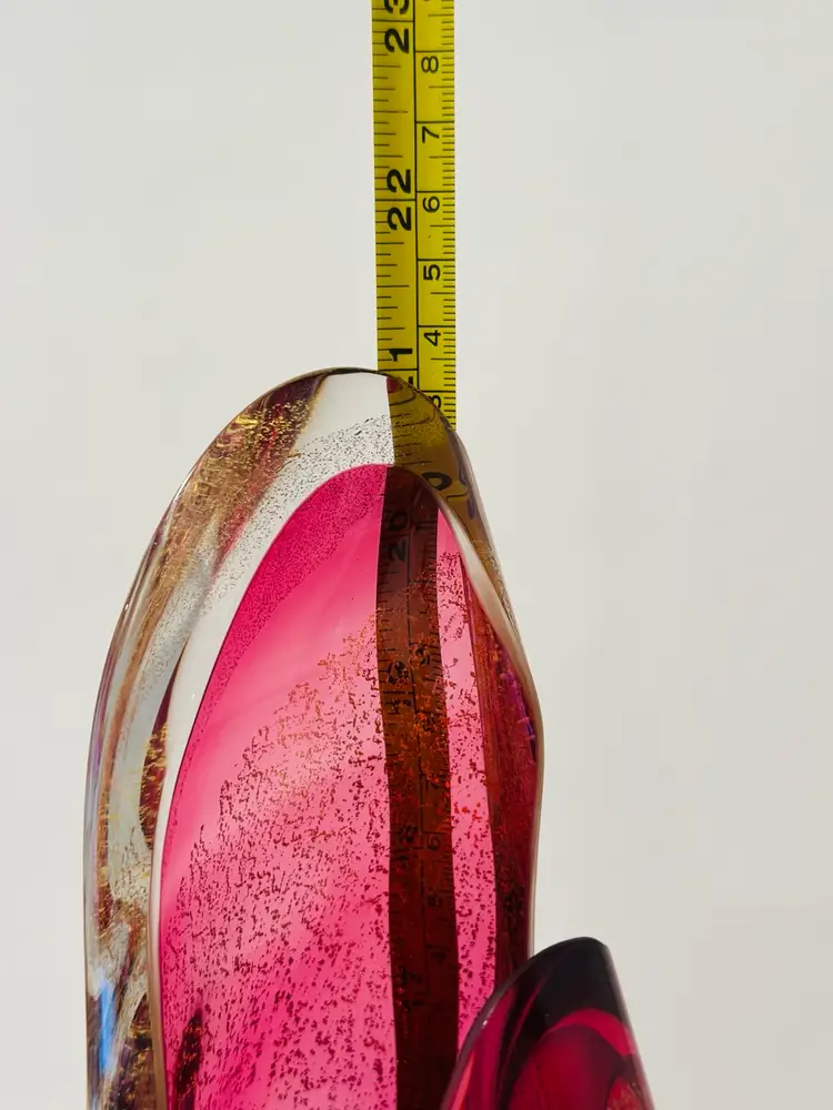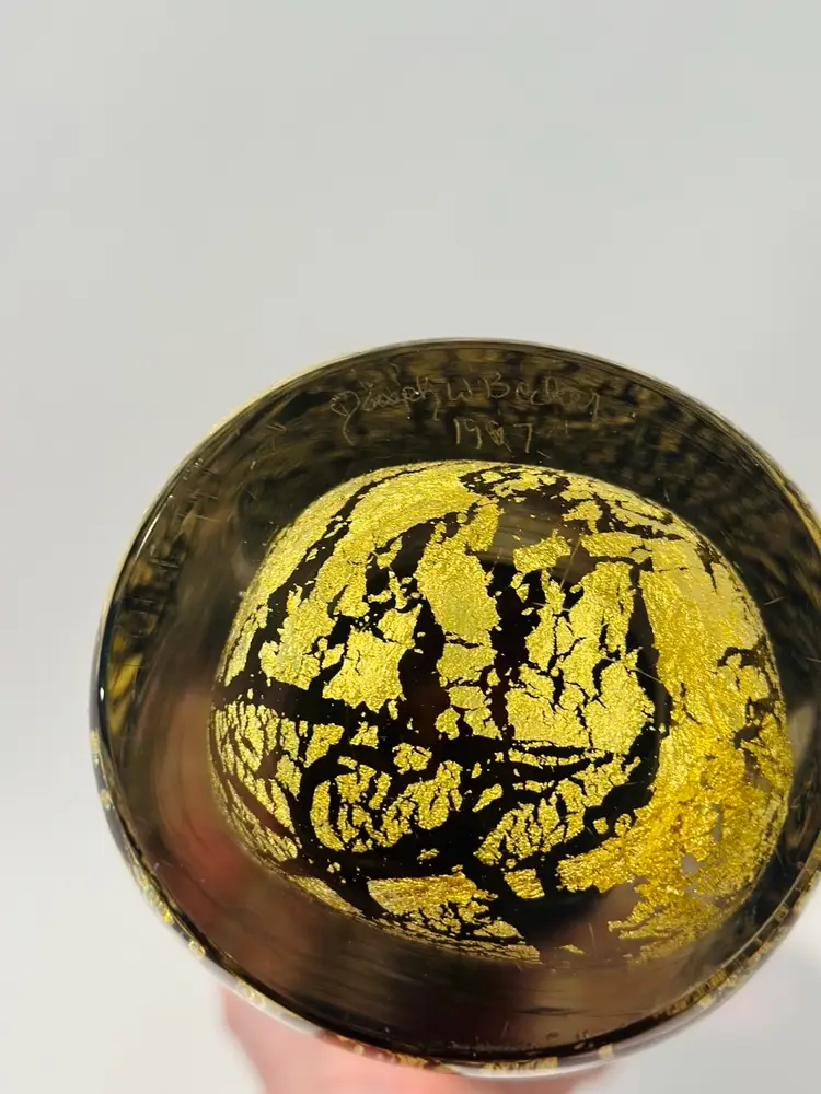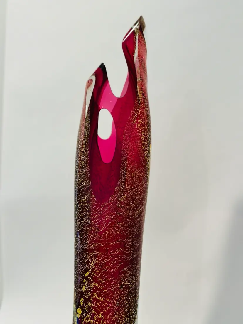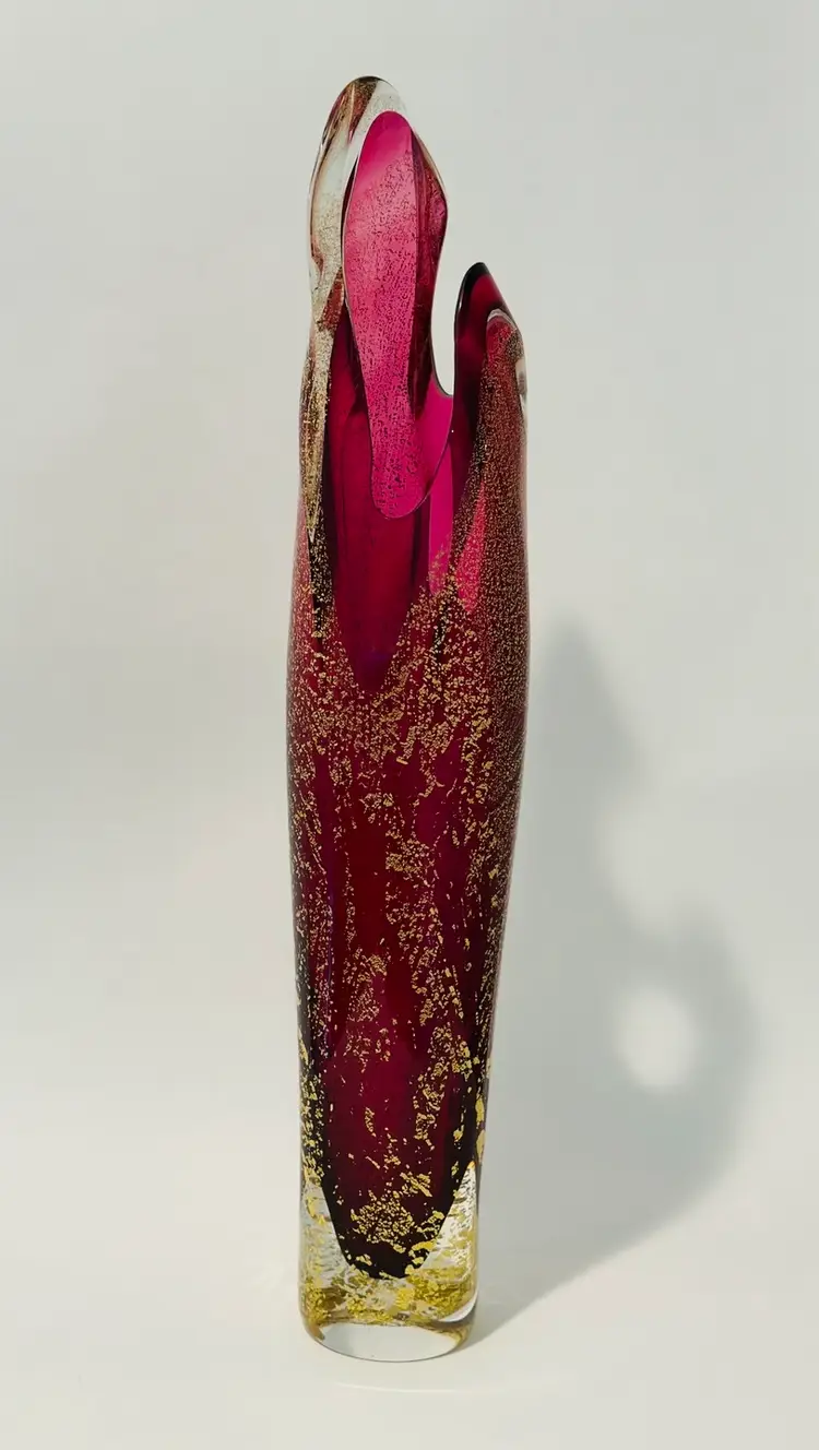This vintage vase is a true masterpiece signed by Joseph W. Becker in 1997. The handblown glass is clear/cranberry color combination with gold fleck is made with an abstract pattern that is both modern and timeless. The gold fleck adds a touch of elegance to the piece, making it a perfect addition to any art glass collection.