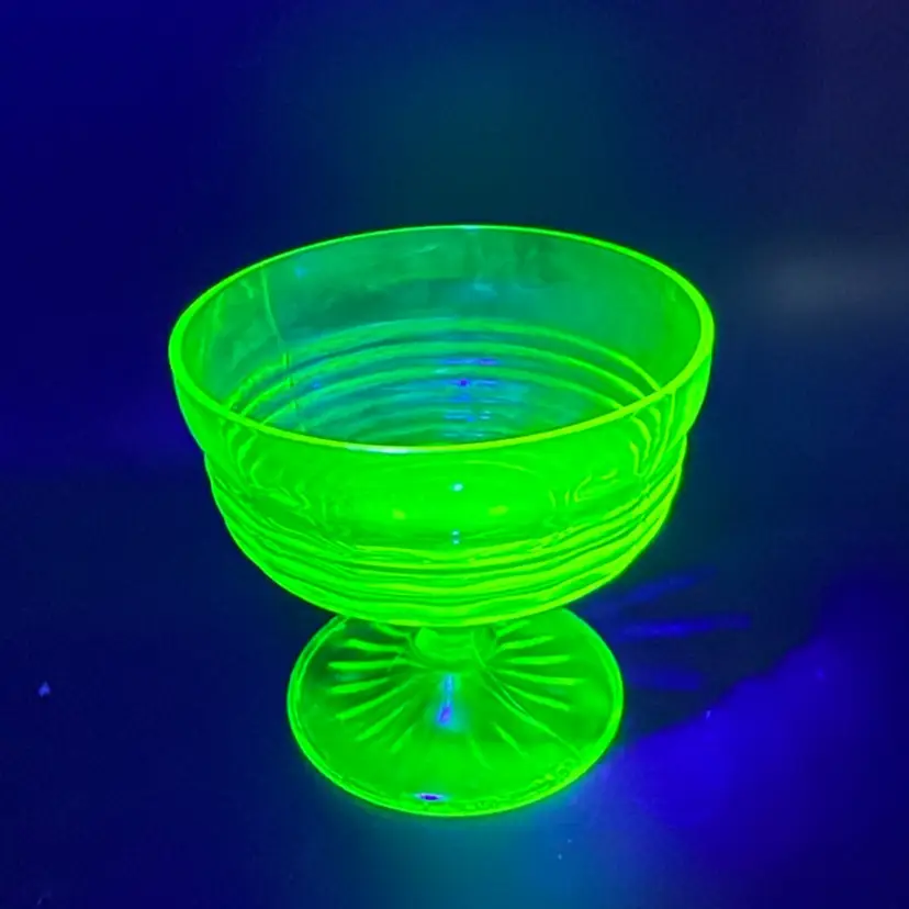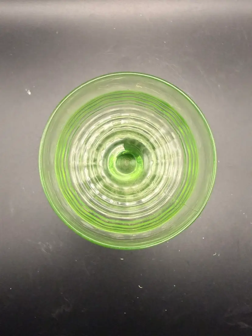 This particular piece appears to be a sherbert cup or champagne glass, likely produced by the Hocking Glass Company, which was a prominent American manufacturer of pressed glassware. The 'circle' pattern, characterized by the fluted base and ribbed bowl, is a common design found in their Vaseline glass production, often dating from the 1930s to the 1950s.