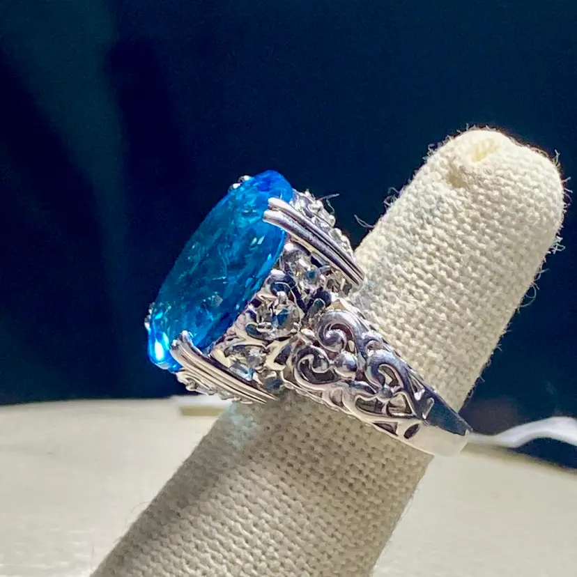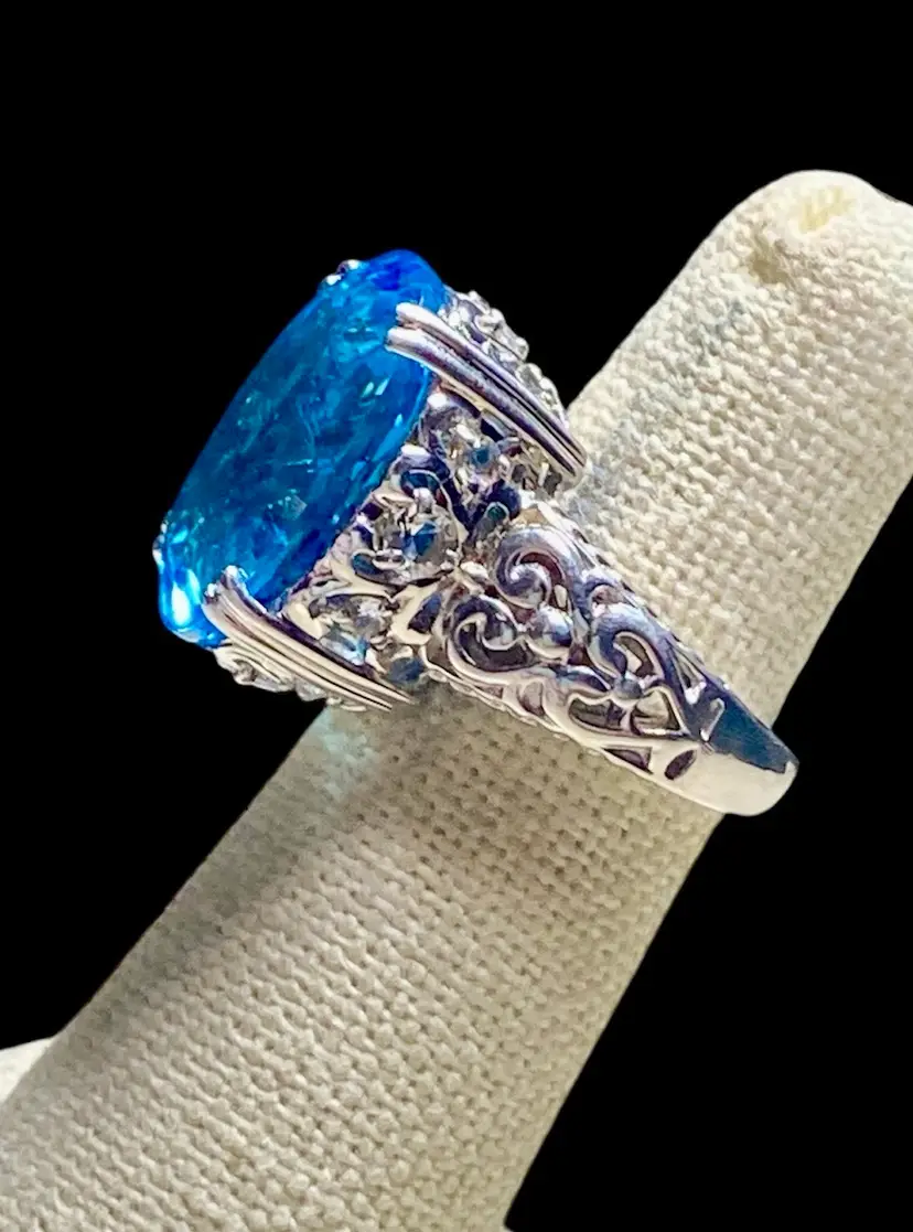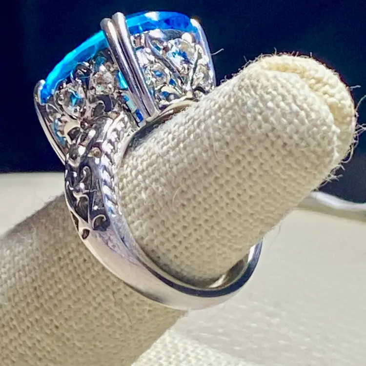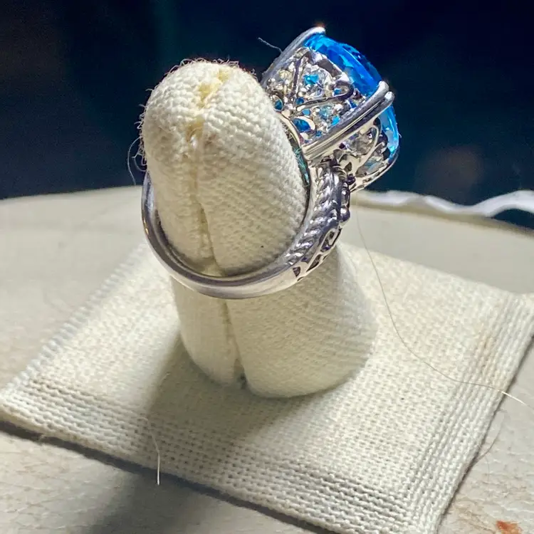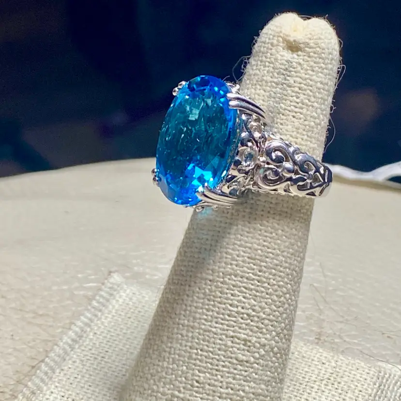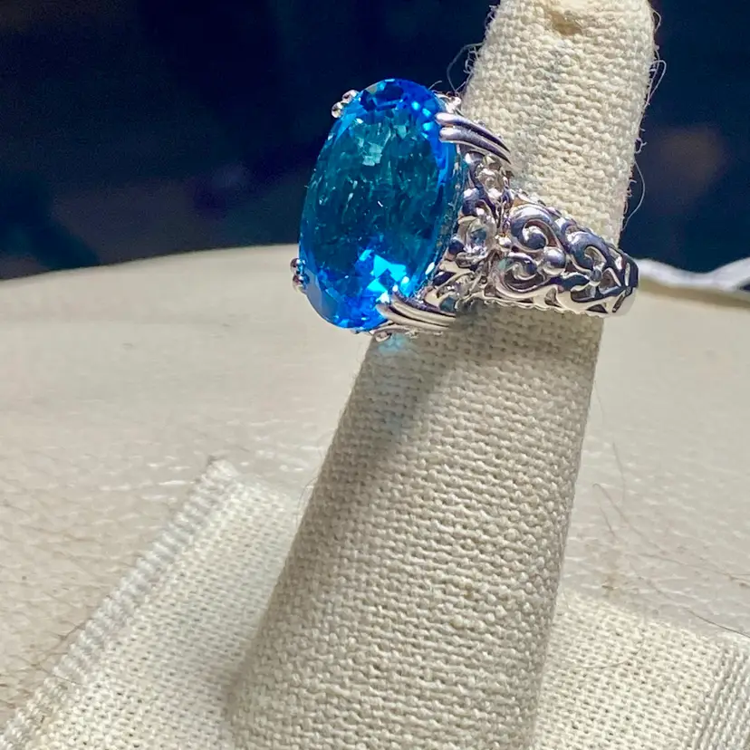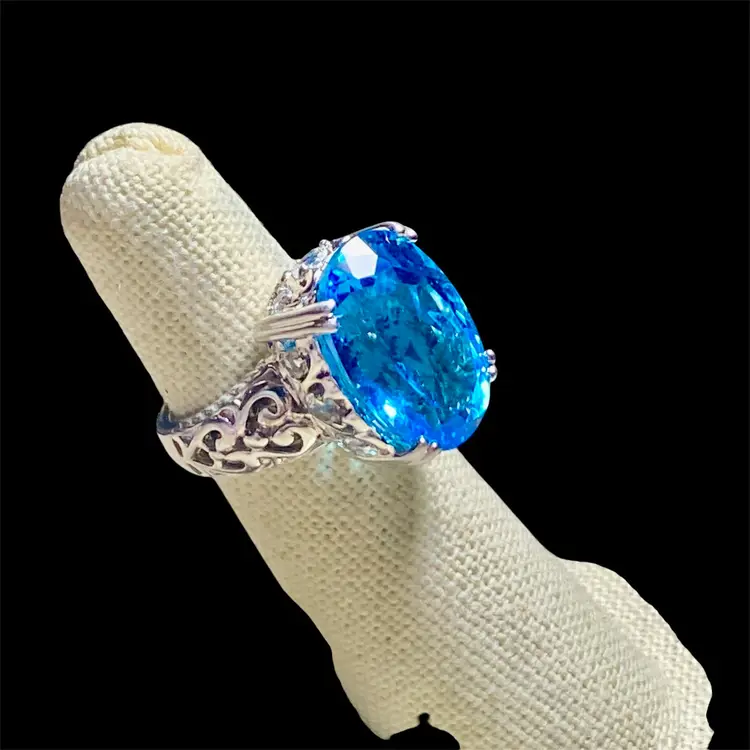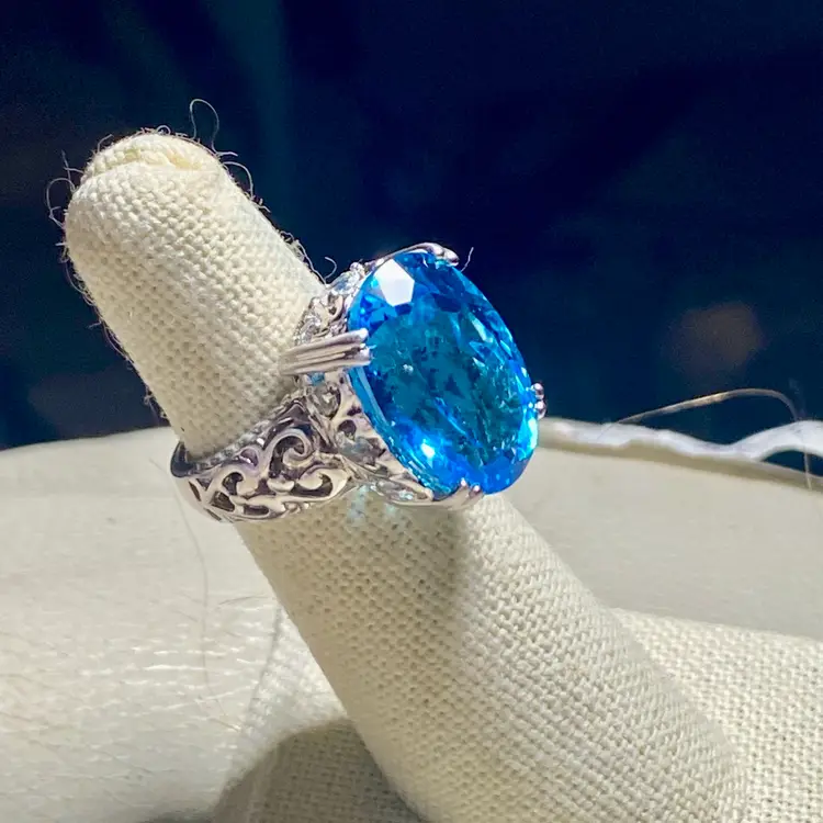 Ring is a Sterling Silver Vault 13.50 ctw "Ostro" Blue Topaz & White Topaz Ring, which was sold on QVC. The ring features a large, oval-cut Ostro blue topaz as its centerpiece, surrounded by smaller white topaz stones and set in sterling silver. Max Ostro, the founder of Blue Topaz, owned the vault the stone originated from. The ring was sold on QVC in 2011 and is now considered a retired item.