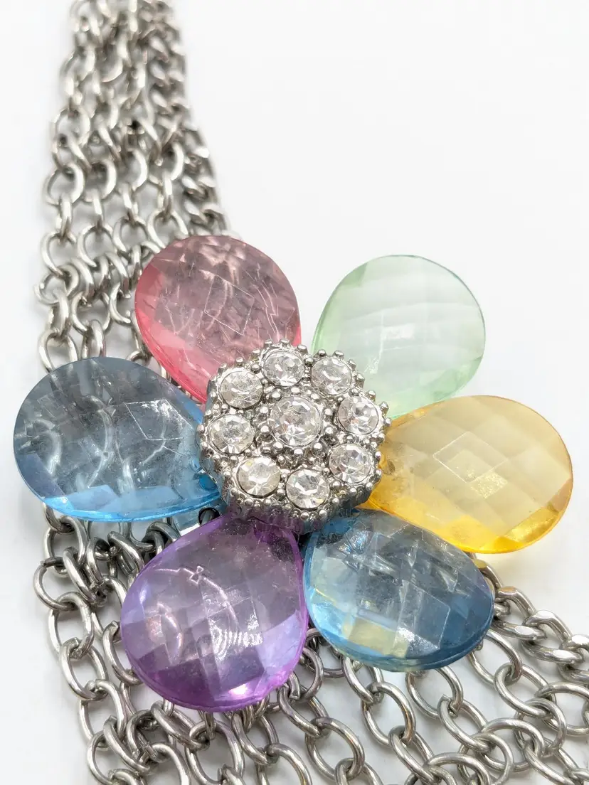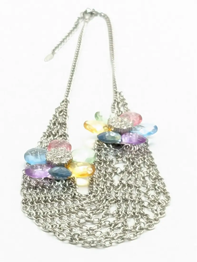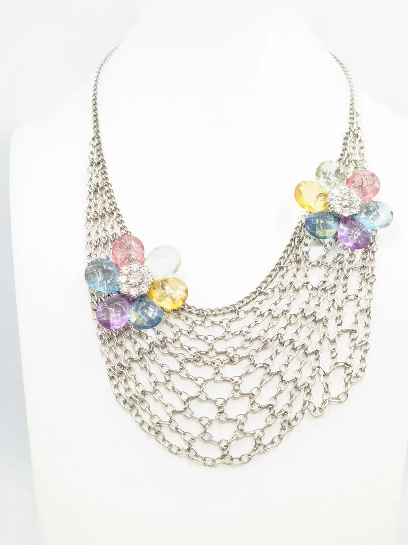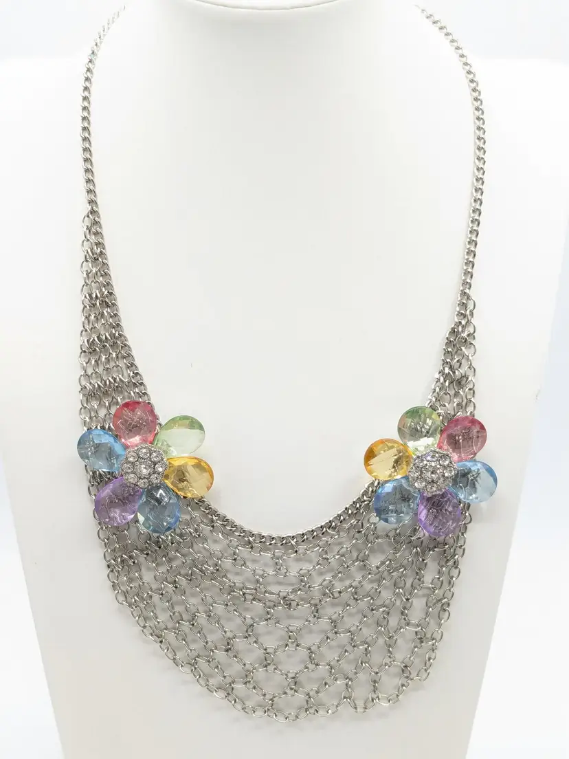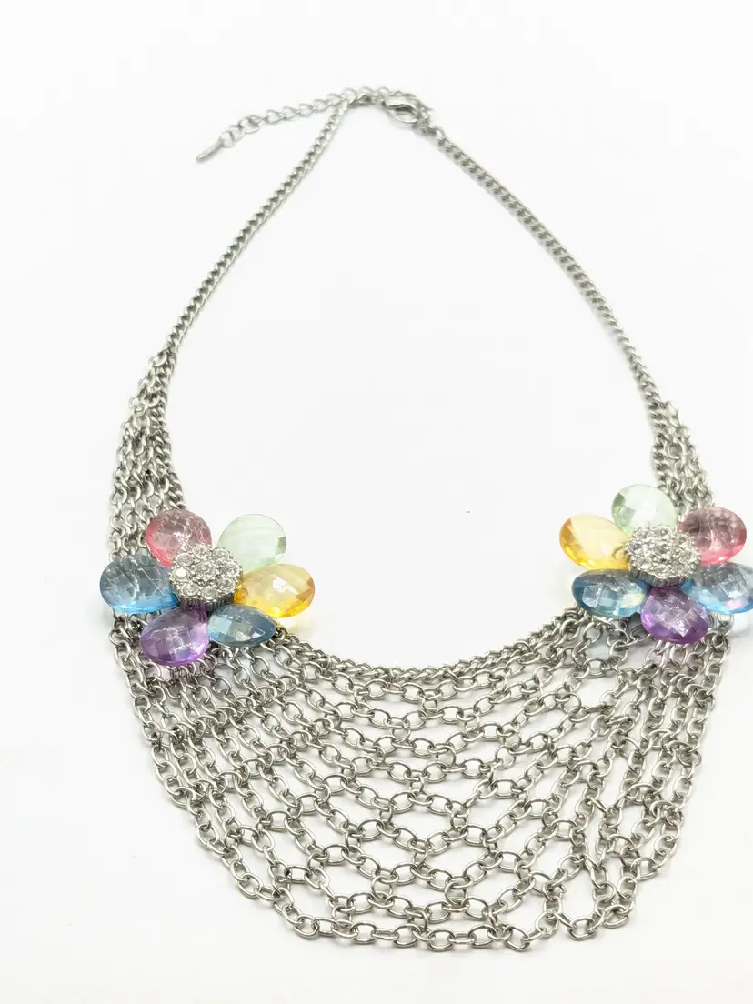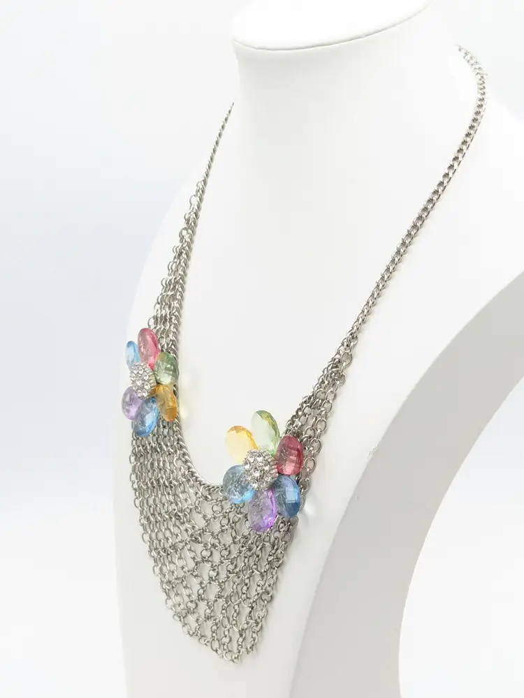 Good condition. This piece gives me mermaid vibes. Silver colour is bright and shiny with no tarnish. Features a unique chain design with two multi-color flower accents. Measures 18" in length with 3" extender. (EN2)