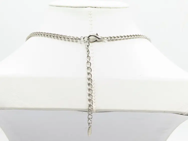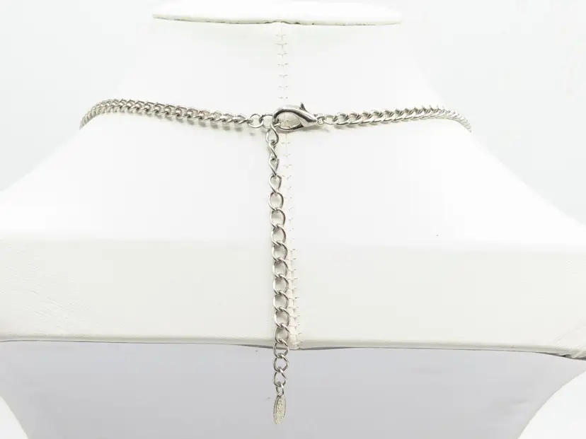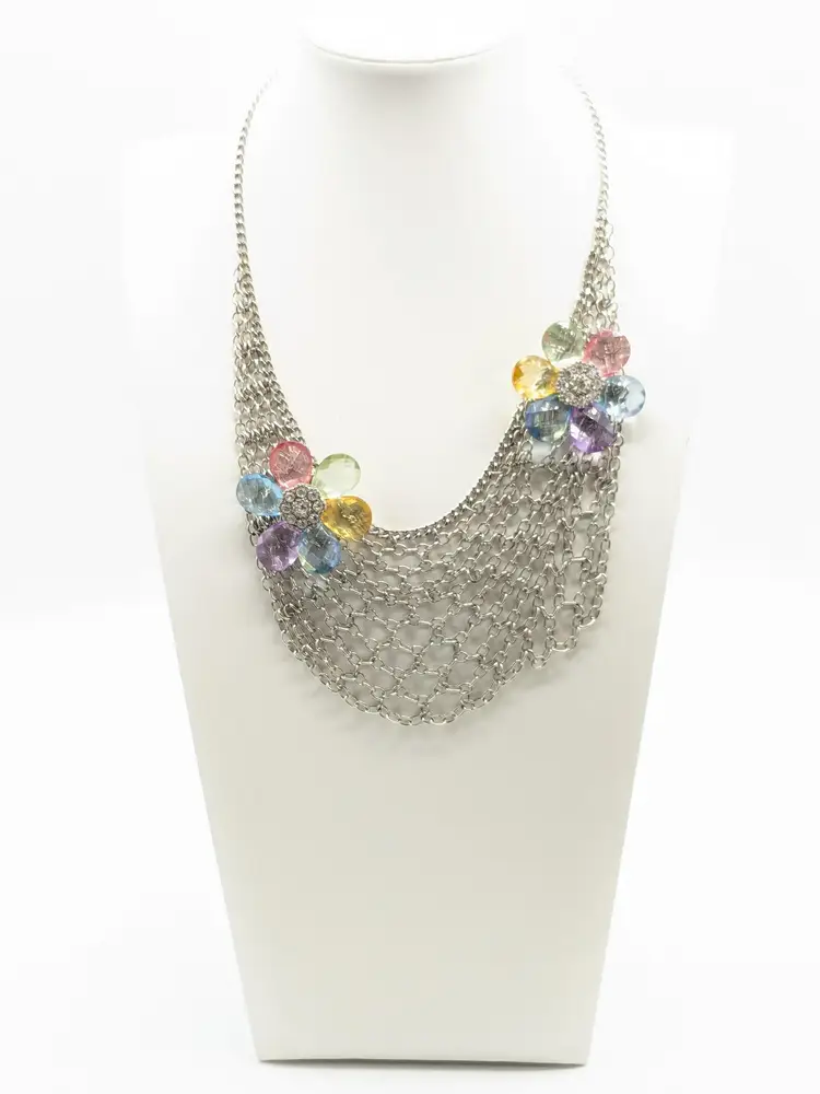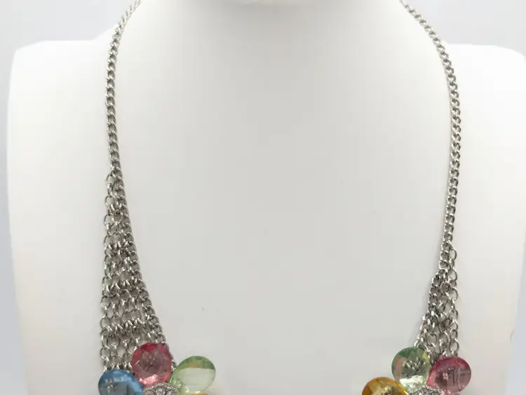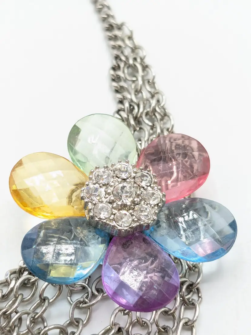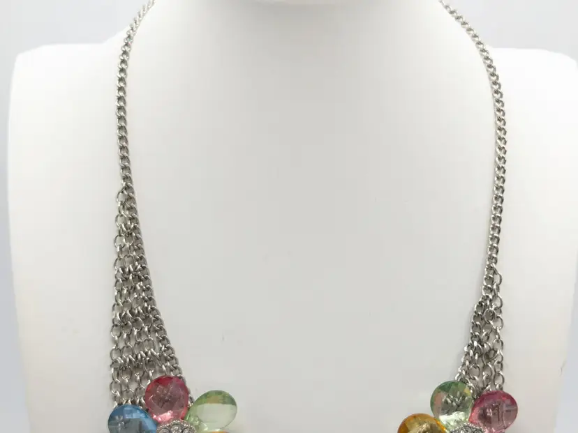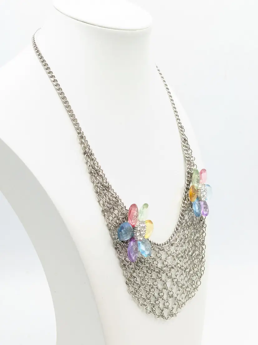 Good condition. This piece gives me mermaid vibes. Silver colour is bright and shiny with no tarnish. Features a unique chain design with two multi-color flower accents. Measures 18" in length with 3" extender. (EN2)