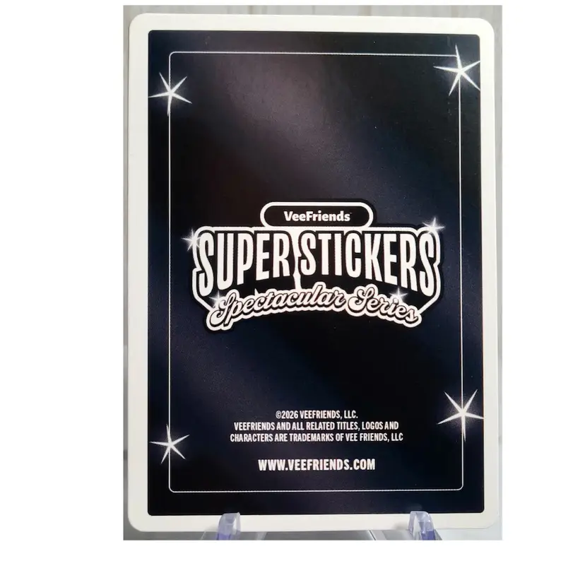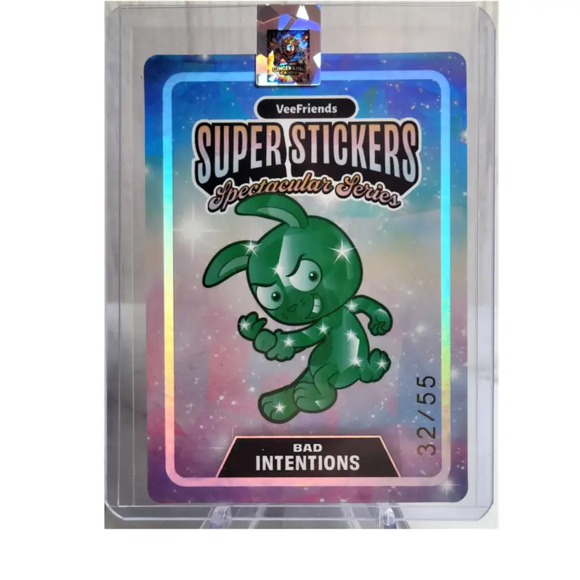 Bad Intentions from 2026 VeeFriends Spectacular Super Stickers featuring an Emerald on Hologram parallel numbered /55. This card blends the Emerald style with a holographic finish, creating a layered dual-parallel look that stands out within the Spectacular Series. With its low serial number and combined parallel design, it offers added appeal for collectors targeting more unique and limited variations from the set.