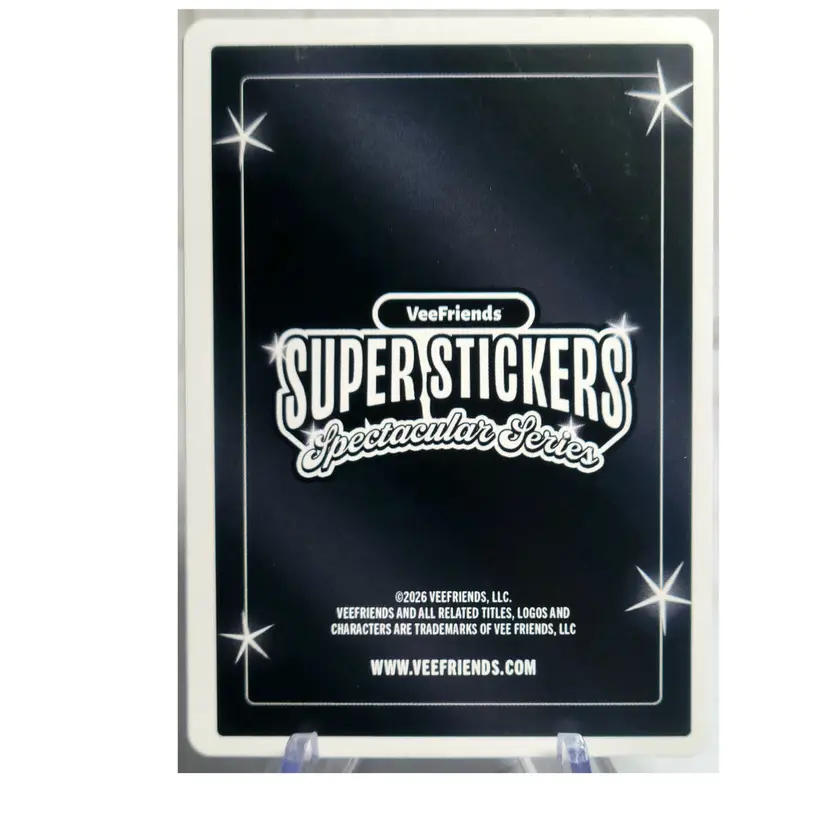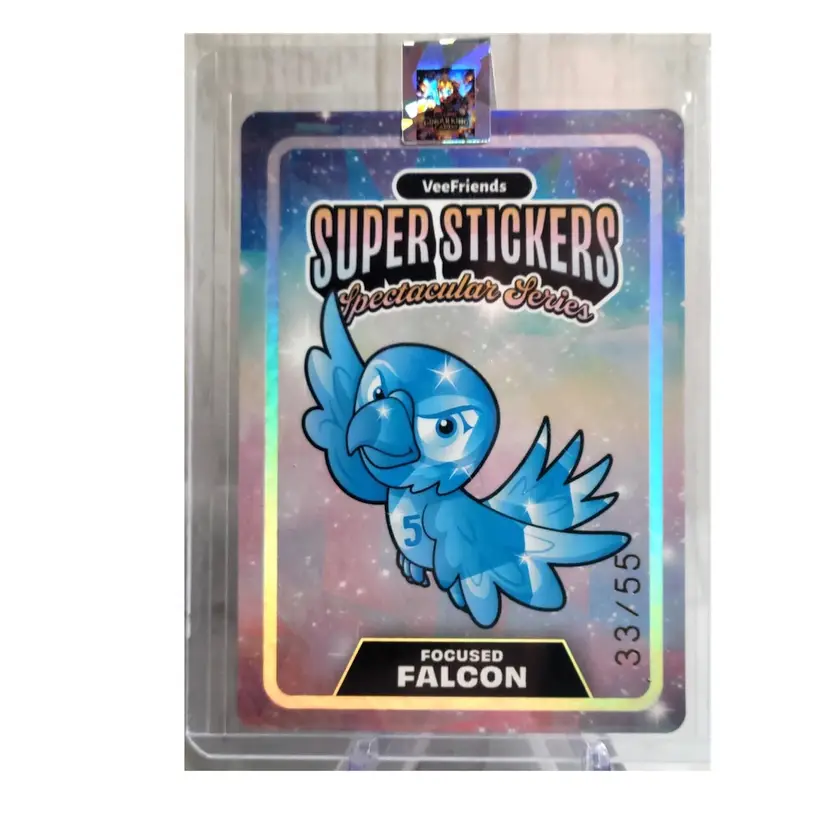 Focused Falcon from 2026 VeeFriends Spectacular Super Stickers presented as a Bubblegum on Hologram parallel numbered /55. This limited release combines the bright, eye-catching Bubblegum style with a holographic finish that really stands out, making it one of the more visually appealing parallels from the set. With its low serial number and growing interest in VeeFriends cards, this is a strong addition for collectors looking to pick up unique numbered pieces from the Spectacular series.