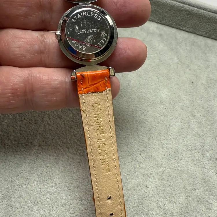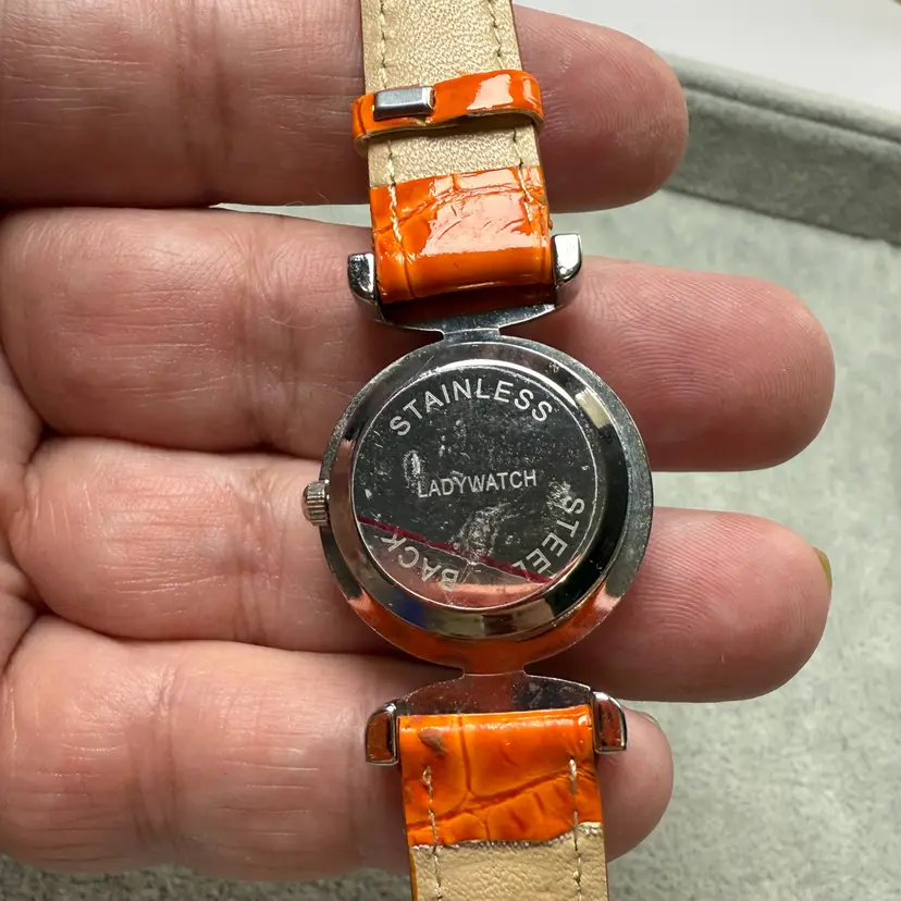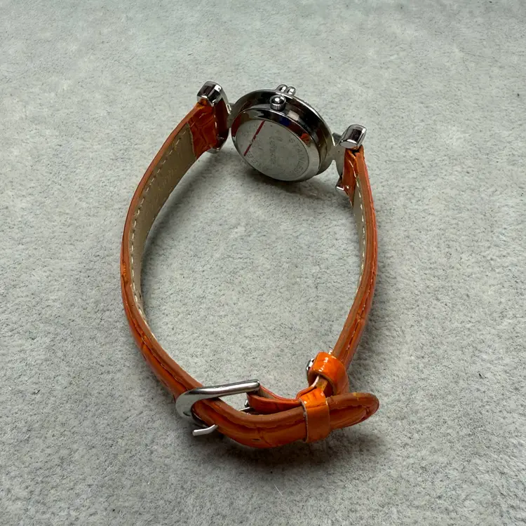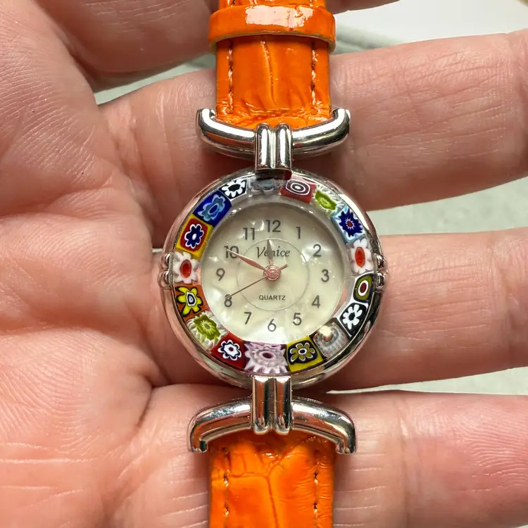 Venice Brand Millefiori Floral Glass Silver Tone Orange Leather Band Women's Watch. Great condition. Little to no wear. I do not think it has been worn. Still has protective film on back. Come with new battery. Works!