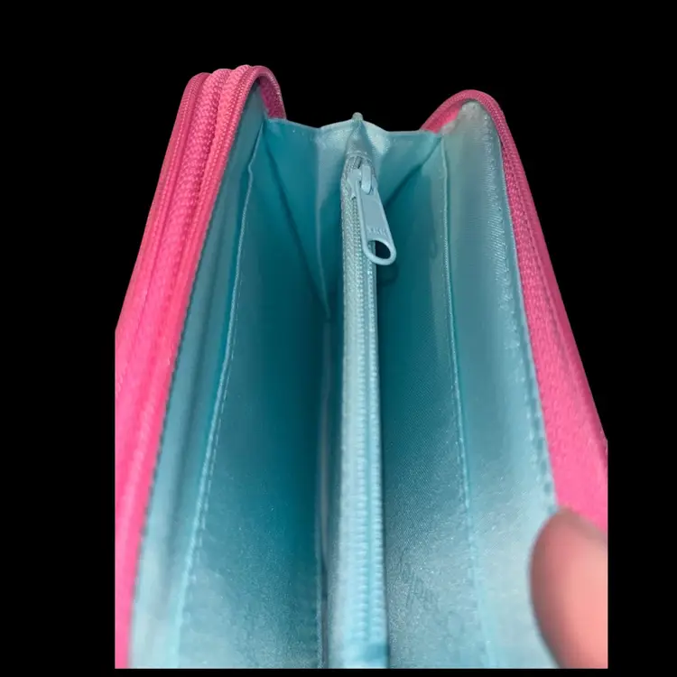 A zippered compartment with multiple card slips, an ID window, and a billfold slip. An additional zippered pocket for secure storage.