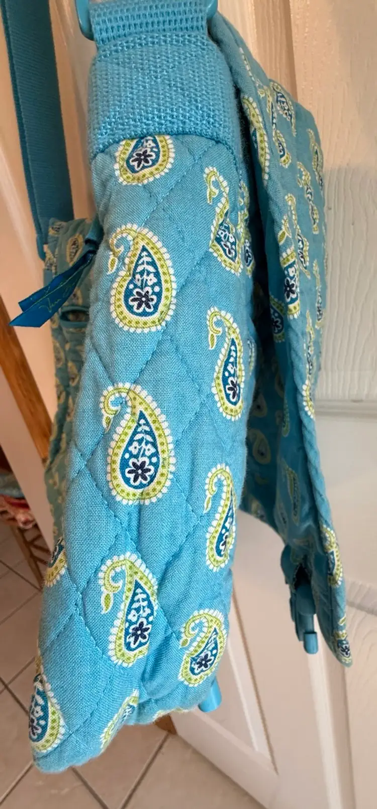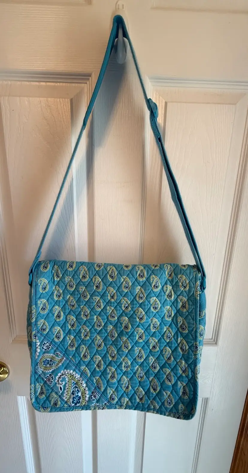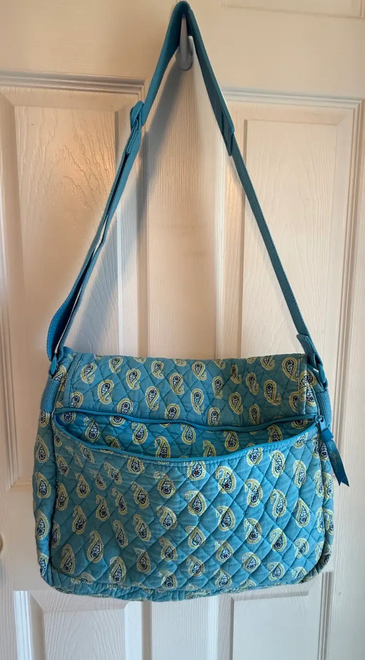 Stylish and versatile, this quilted blue paisley shoulder bag is perfect for everyday use. Its vibrant design adds a pop of color to any outfit. Adjustable strap, one big flap in the front great for Security. Multiple pockets on the inside and one outside pocket please see photos. Great condition. The width is 15 1/2 inches wide by approximately 12 inches high that is with the flap down the bottom measures with 13 1/2 inches and height on the bottom is 3 1/2 inches take care and talk to you soon